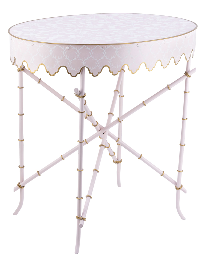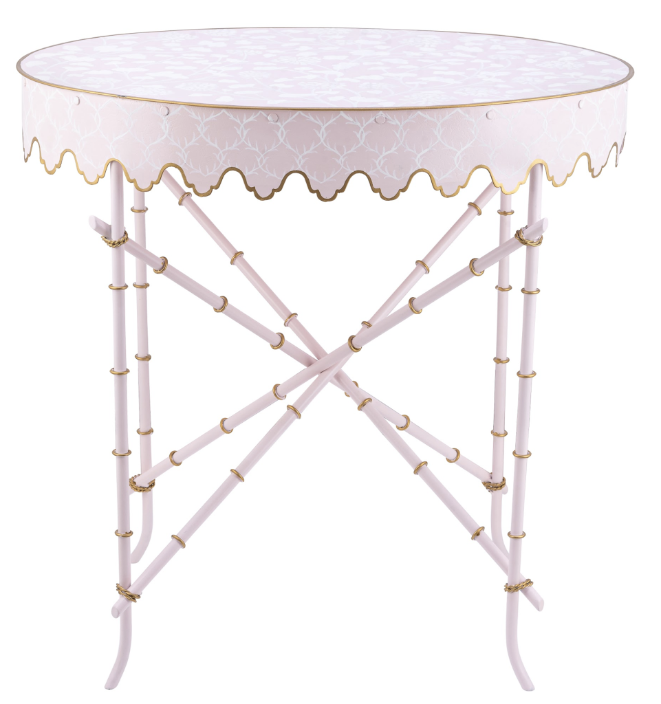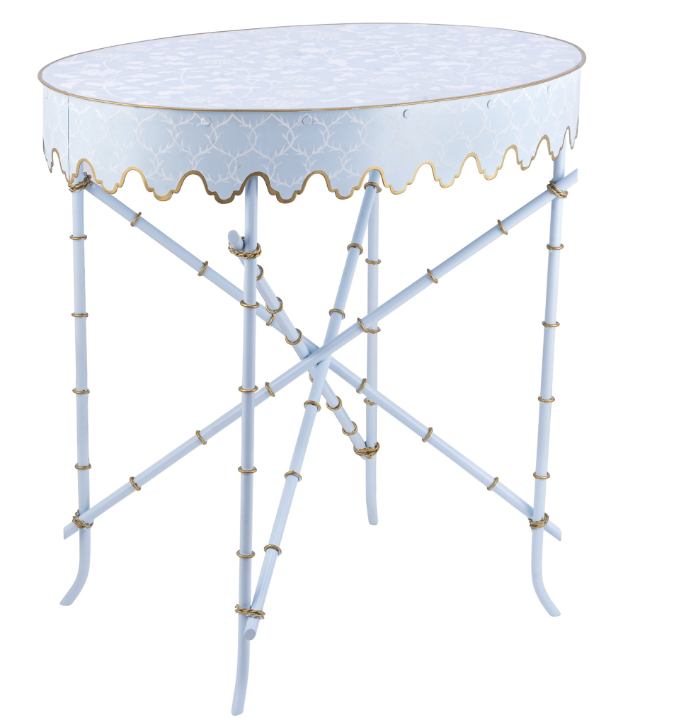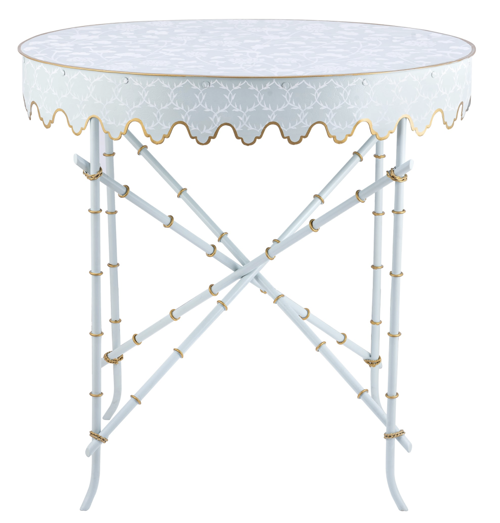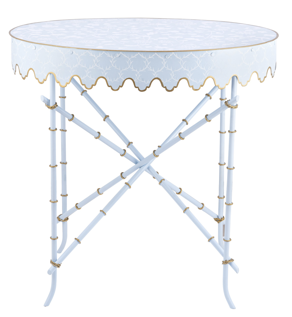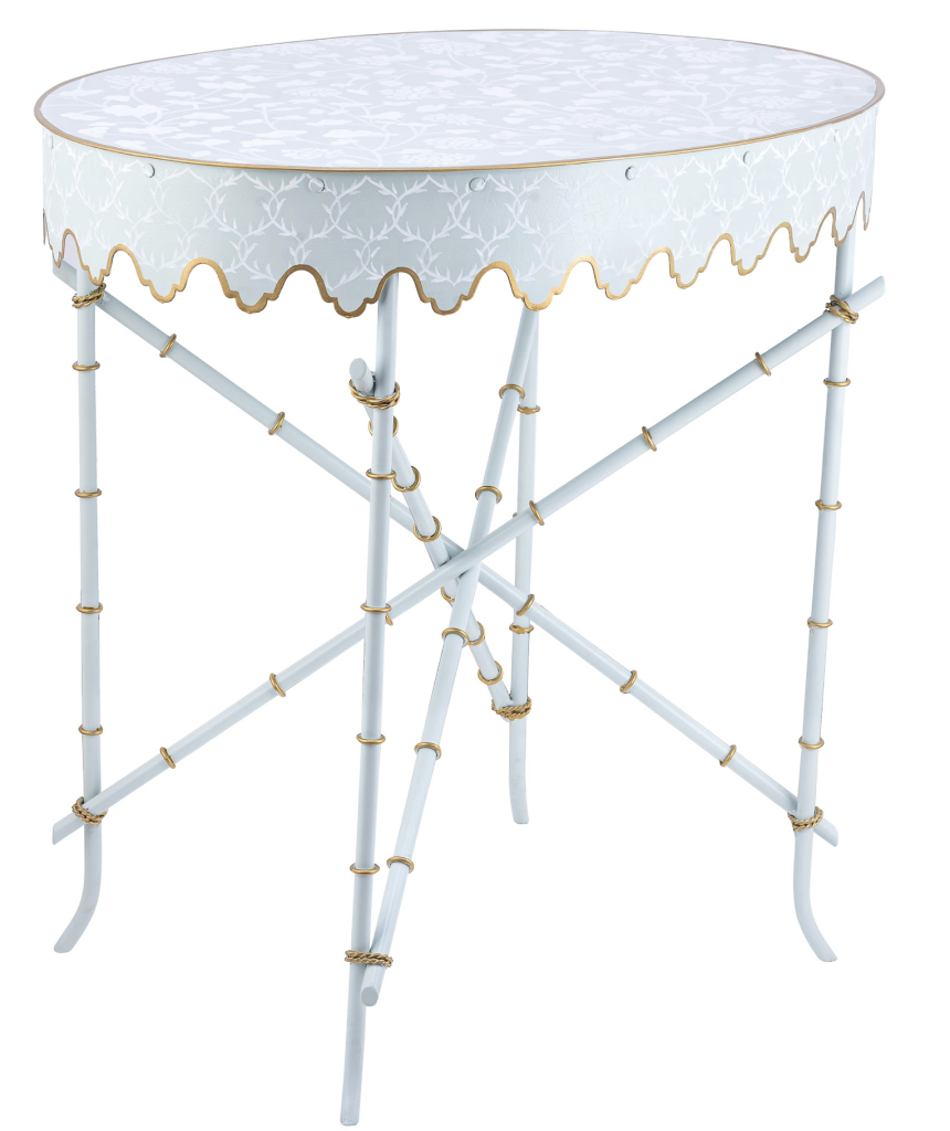 ITEM 6 Did someone say tray tables! These incredible scalloped trays tables are amazing and so beautiful. Love the floral/trellis design with the fabulous scalloped edges pipe in gold. We love them so much, we offer them in four amazing colors! These are great to use as a side table, end table, when you need an extra table to pull up, and light enough to move around. Super versatile.