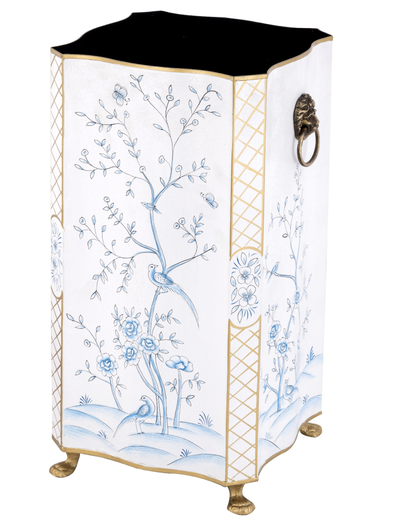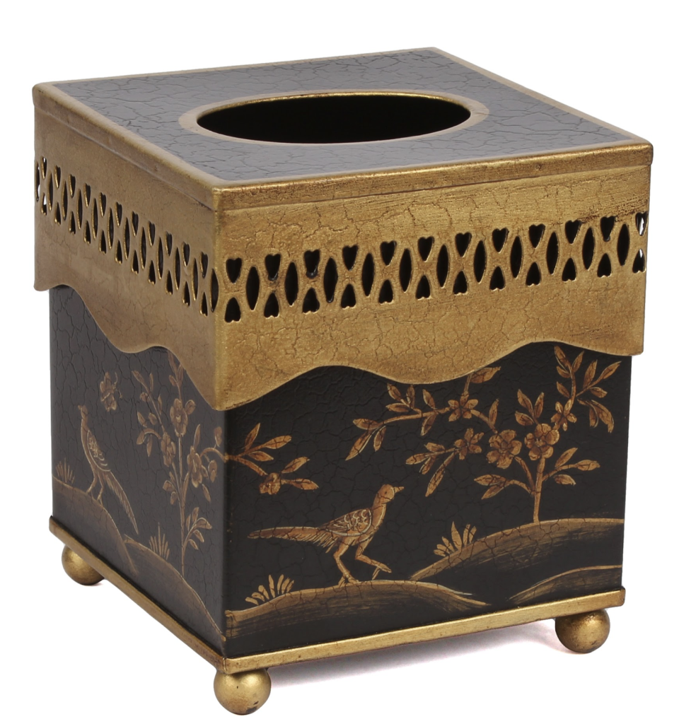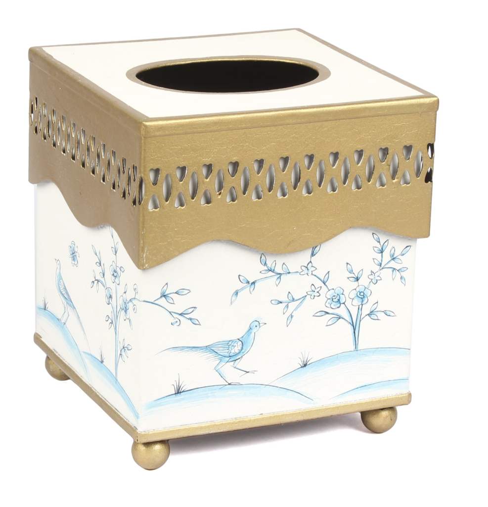 ITEM 11 A beautiful best selling tissue box that has been out of stock is coming back, these are so beautiful in any room. Who knew you could make a statement with a tissue box! Hand-painted with the most elegant pierced border, talk about details, the chinoiserie pattern is painted on all sides of this elegant piece.