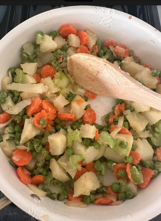 2. In a large pot, melt the butter over medium-high heat, then add the onion, carrot, potatoes and celery. Cook, stirring occasionally, until the onion begins to turn translucent, about 3 minutes.