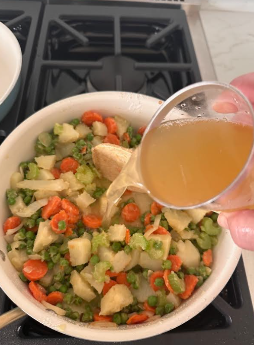 3. Stir in the chicken then sprinkle the flour over top and stir it until it’s all combined with the meat and vegetables. Cook for 1 minute, then pour in the chicken broth. Stir and let it cook and thicken. Once it starts to thicken add the salt, pepper, and thyme.