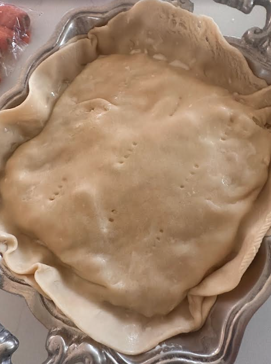 6. Line the bottom of a baking dish with one slightly rolled out (thawed at room temp) pie crust
