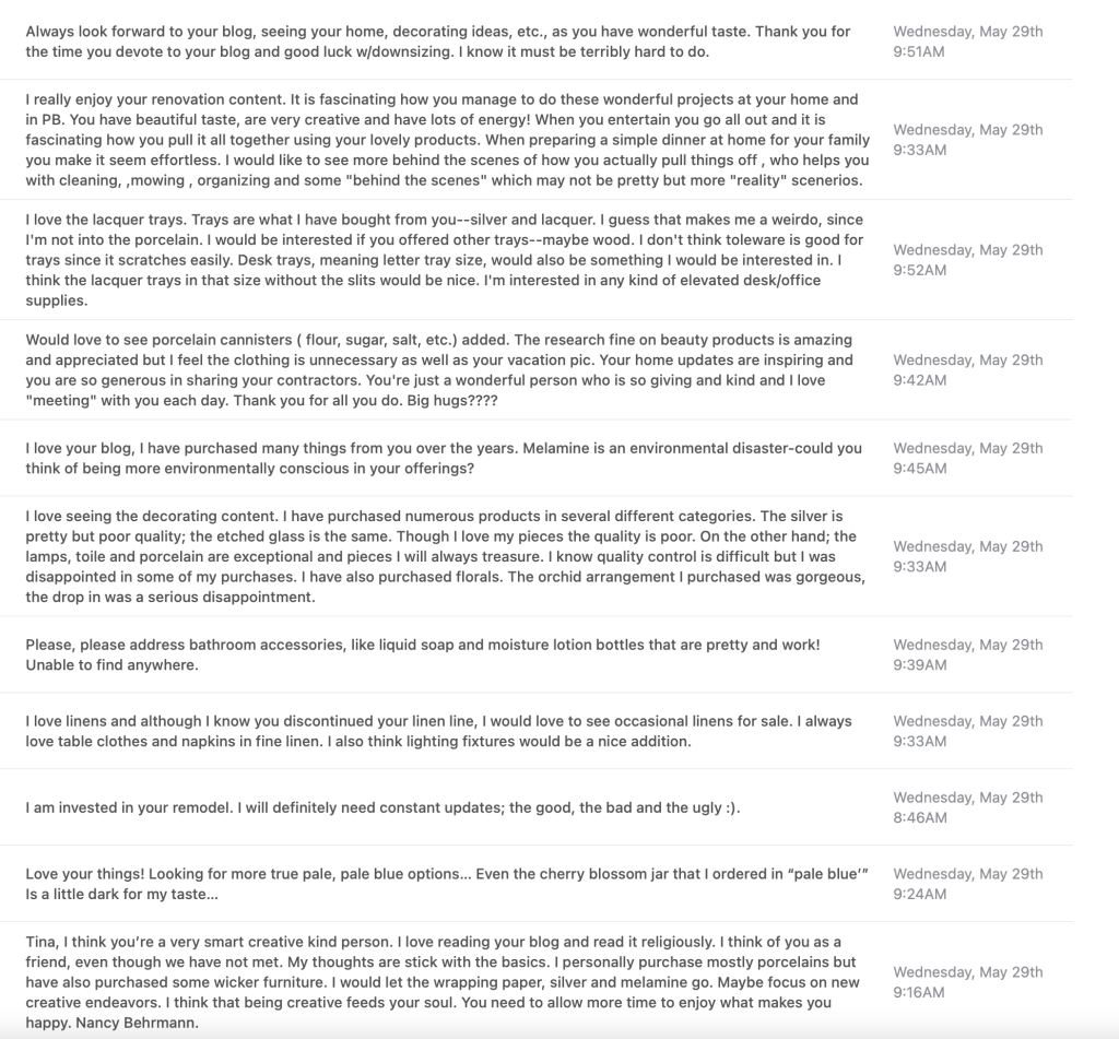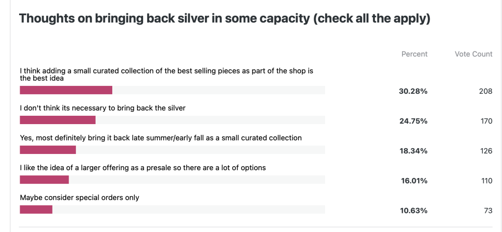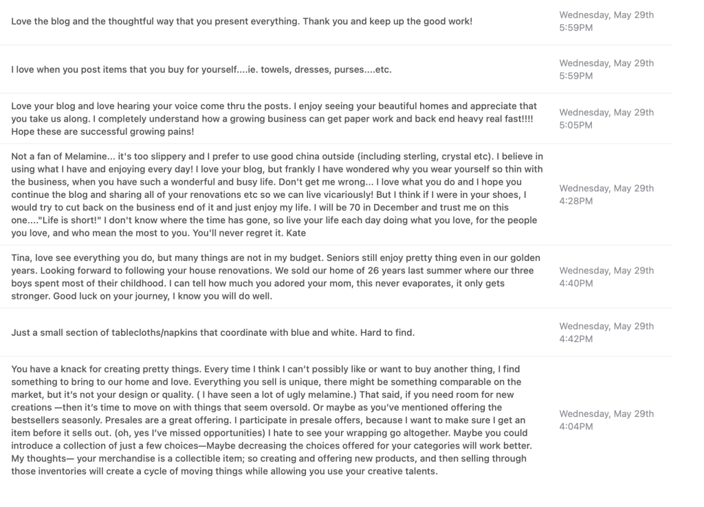 Seems almost many of you like the idea of bringing back a small curated collection whether for one time offer or continually throughout the year. I think we will offer one small curated collection as a one time presale later in the summer (in anticipation of the fall/winter entertaining season)