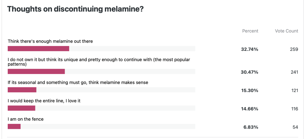 Thoughts on the melamine- interesting that collectively 44% thought its worth keeping. I love it too so it’s a tough call, I know it is so unique and pretty and much more sophisticated than most melamine patterns out there. I am still deciding on what to do….