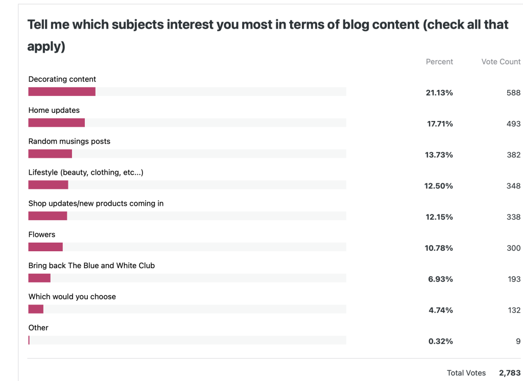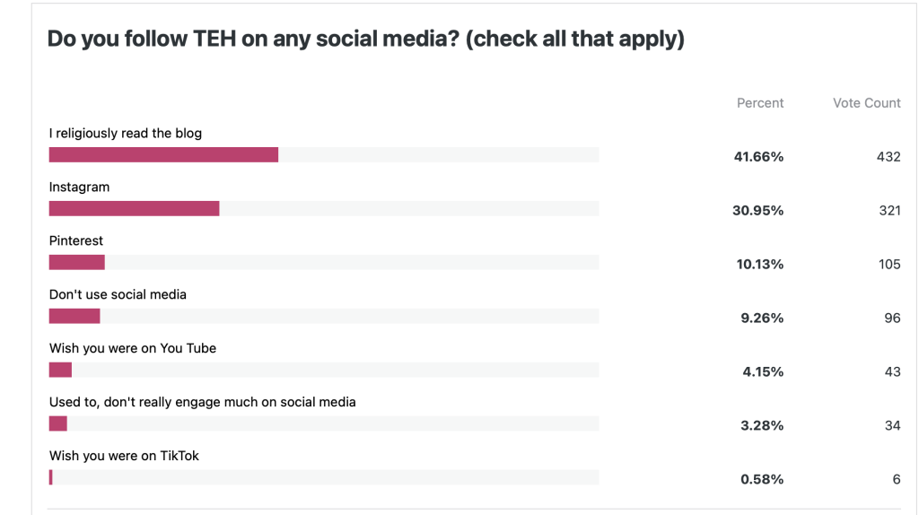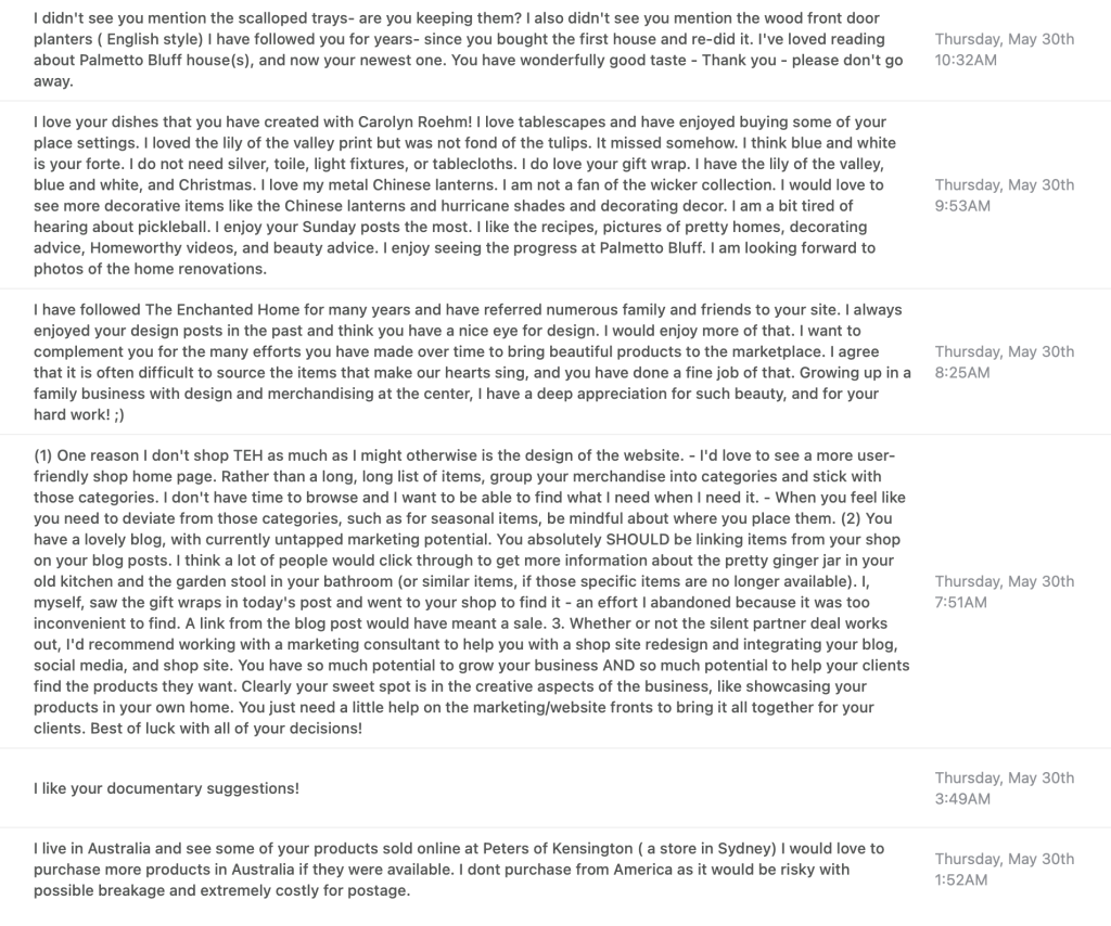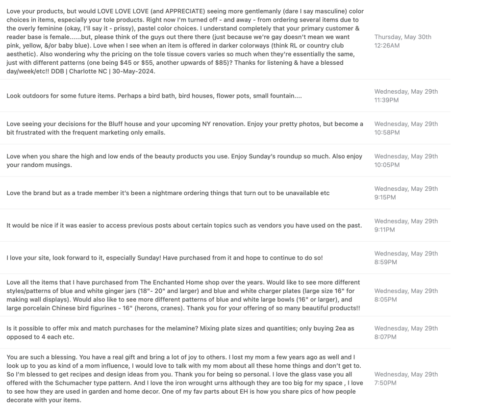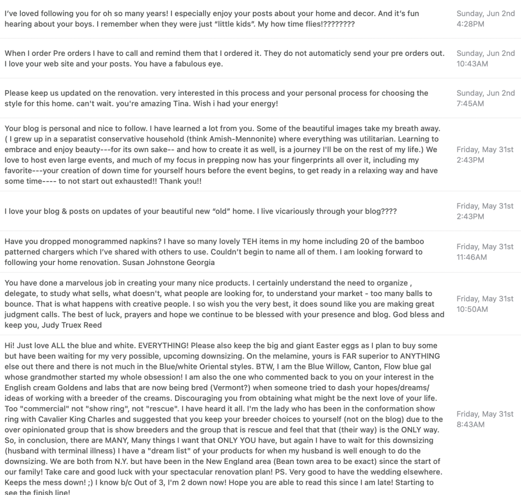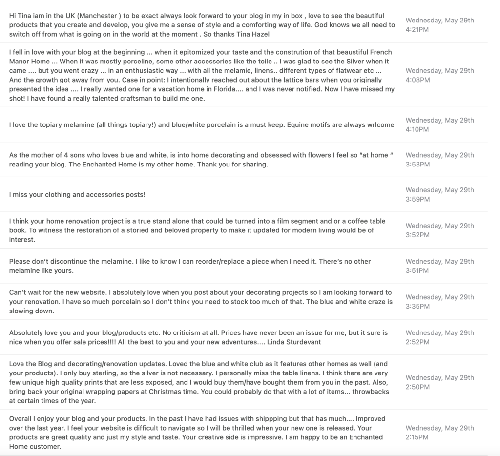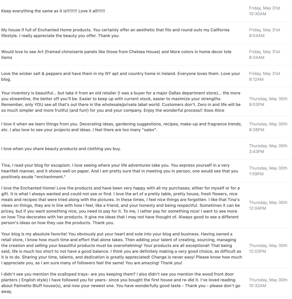 So thats the gist of the feedback and overview of the polls and a few tidbits I wanted to share. Please know anytime you want to voice an opinion, have a suggestion or need to speak to someone please always feel free to email info@enchantedhome.com or me personally tina@enchantedhome.com. Sometimes my email box is overflowing (well every day) but I do try to read my emails as often as possible and respond. Thank you again for your input, support and enthusiasm for The Enchanted Home. You are certainly a big part of why and how we grew!