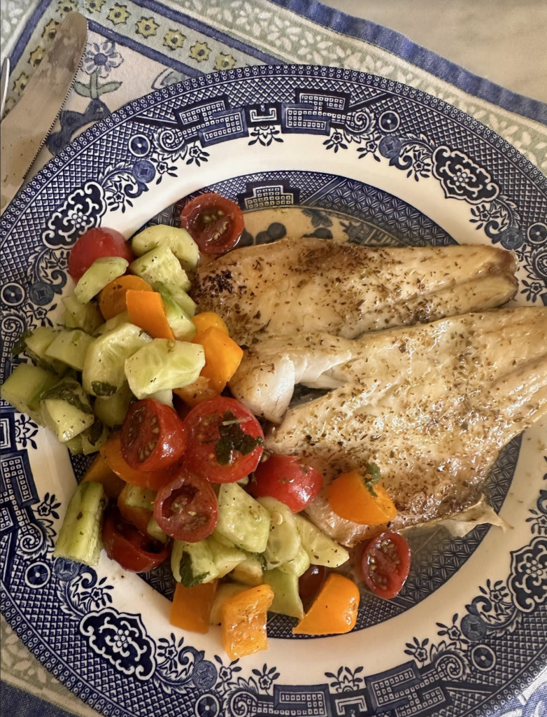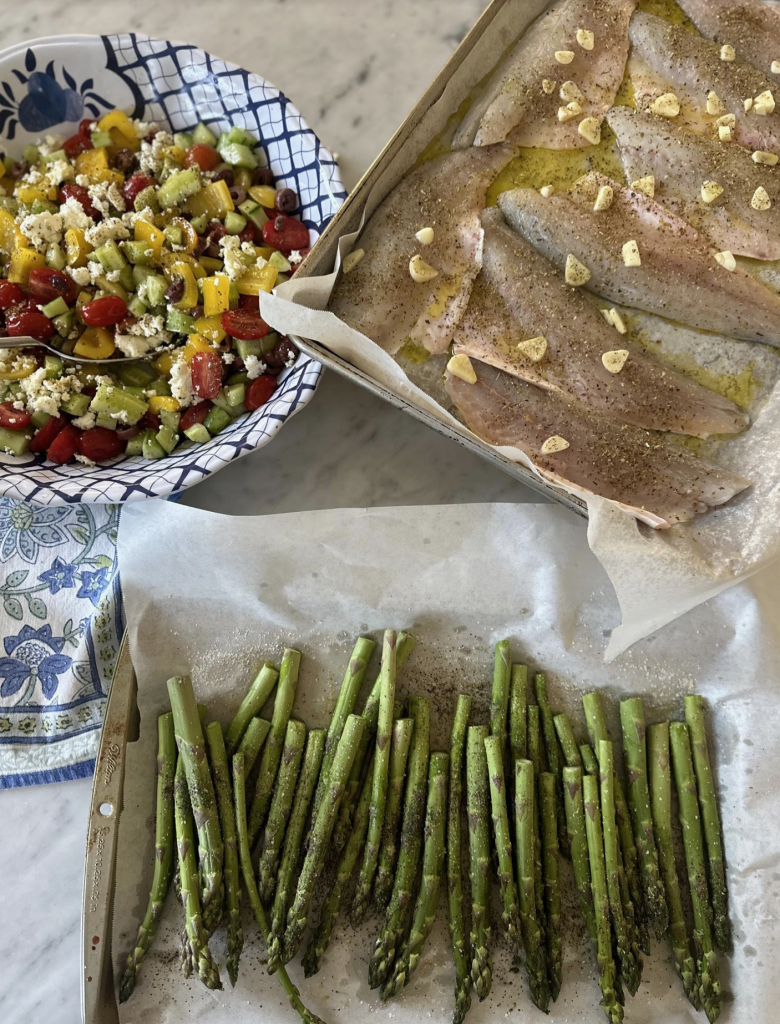 Three simple dishes for the most delicious meal I make 2x a week, Branzino chopped Greek salad and asparagus (or whatever vegetable I have on hand)