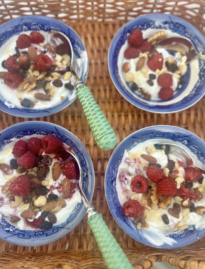 This I swear is every bit as good as ice cream, I take half plain Greek yogurt and half vanilla Greek yogurt, mash fresh raspberries into it, with a handful of the assorted raw mix (found at Trader Joes) It is soooo good. Perfect blend of sweetness, tartness and crunch!