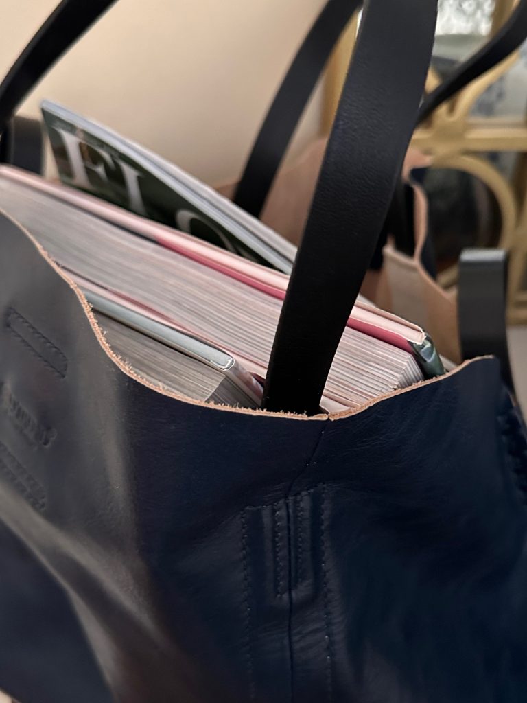True fact- as we are still bringing the final little odds and ends from house to house, I used this tote to carry loads of things back and forth,  books, magazines and in one trip- a big stack of dinner plates. It went the distance:) Mine is a very dark navy which almost looks black.
