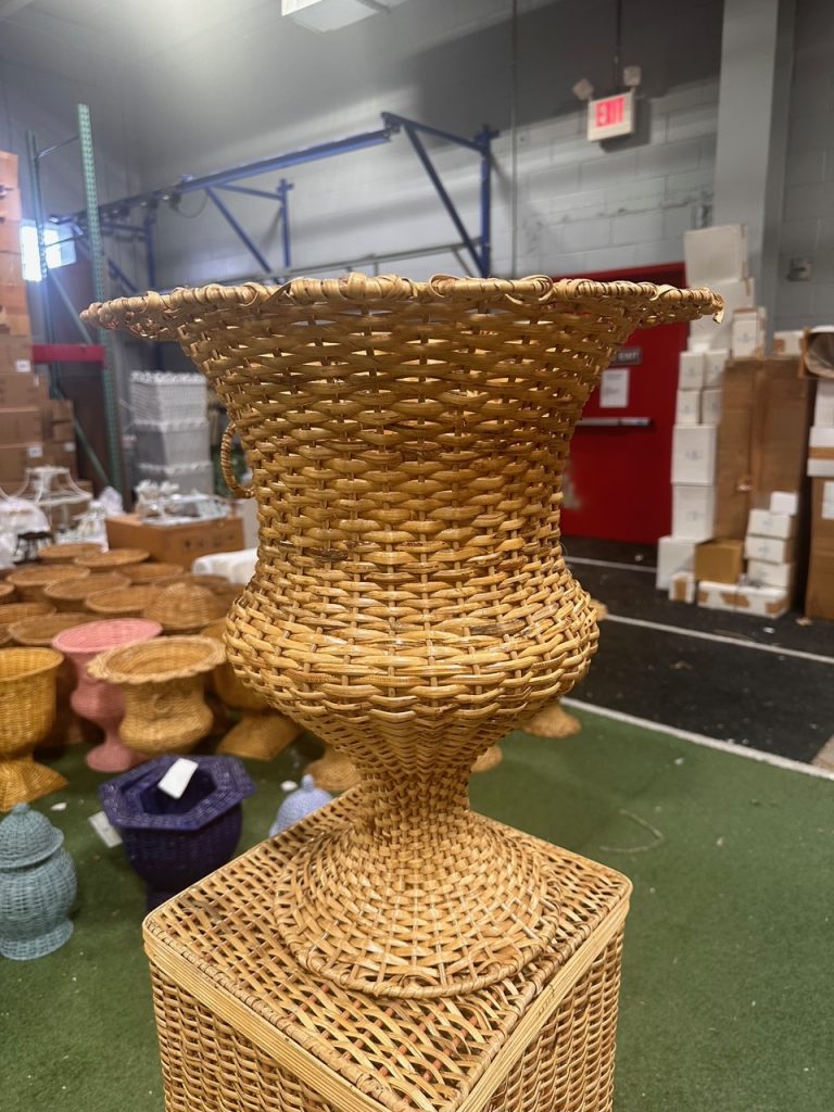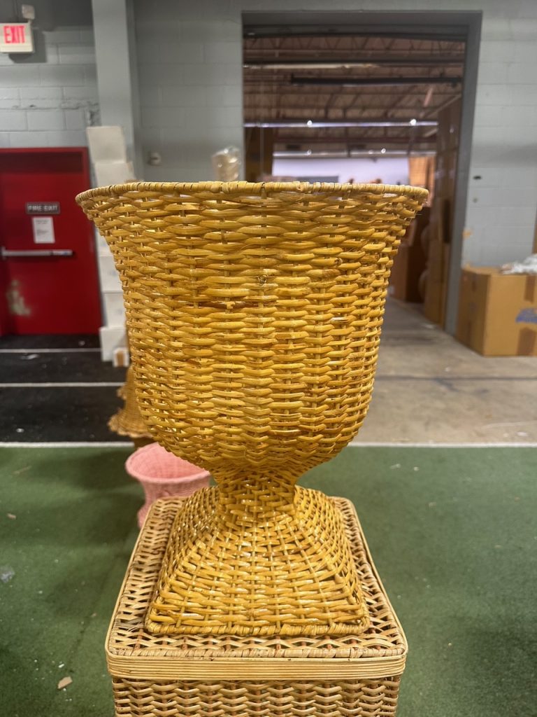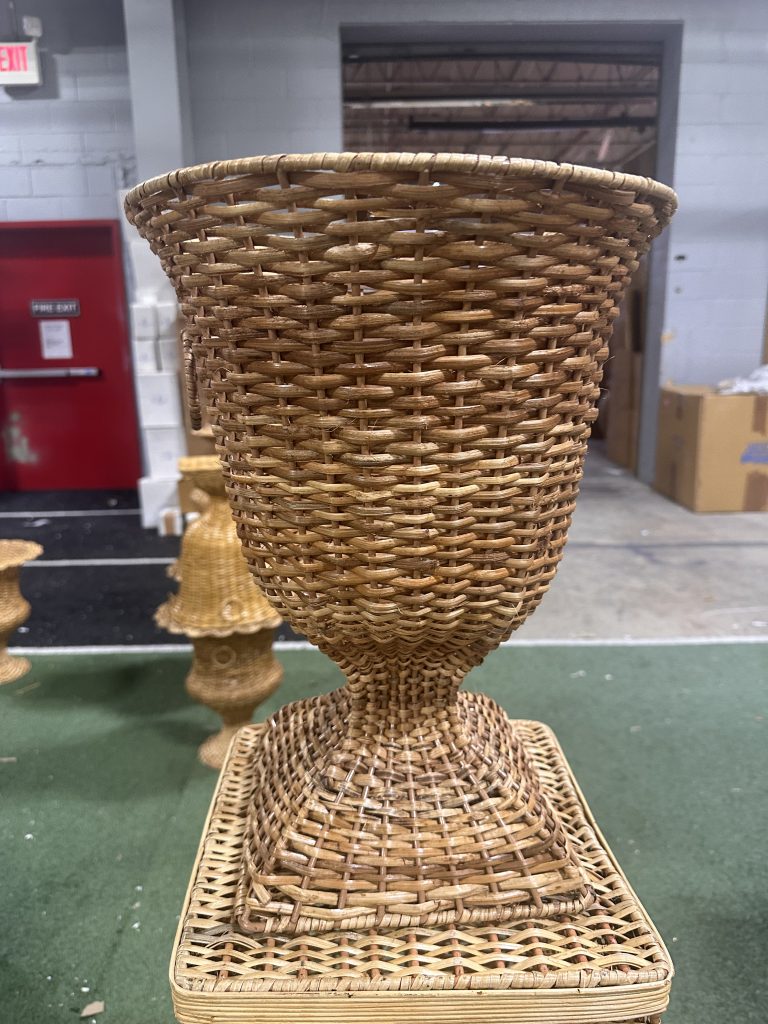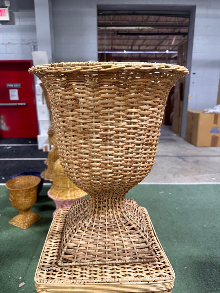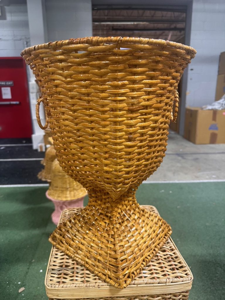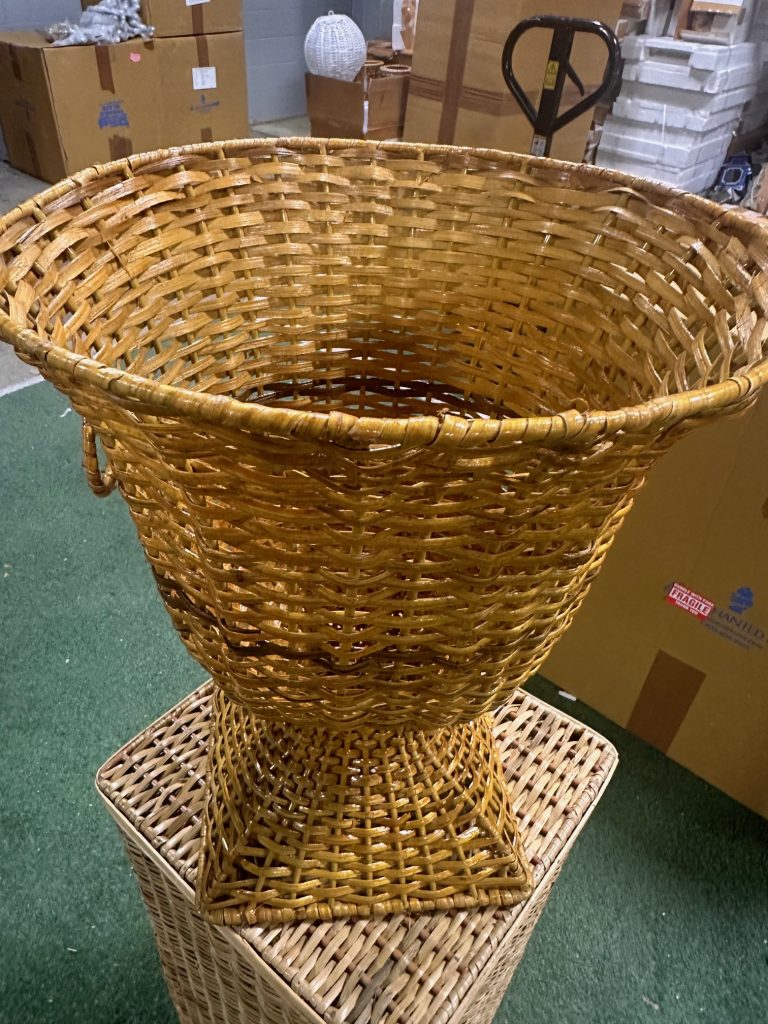 ITEM 12 Talk about an urn with character! Since wicker is a natural material, as you know, variations will occur in coloring. This one has a darker “stripe” going through it. It could certainly has used as is or easily spray painted.
