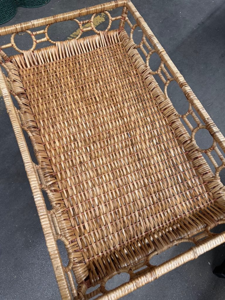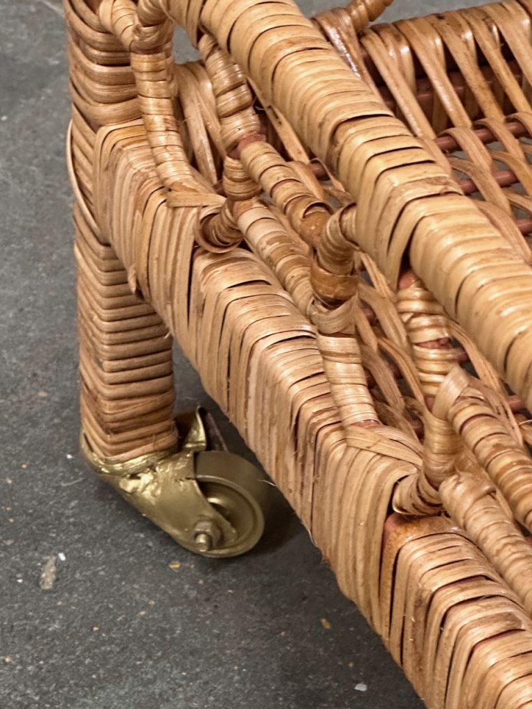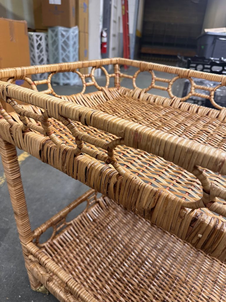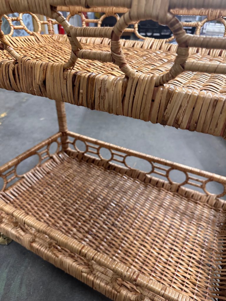 ITEM 3 We have 5 of these fabulous wicker bars up for grabs. We received these gorgeous wicker fretwork bar carts in. Several came in with either damaged or missing wheels. The damaged ones were discarded, theses are all in good condition but are missing wheels or need wheels fixed. So these are up for grabs and being sold as is. You can either have new wheels put on or just remove the wheels altogether . Either way you will have yourself one incredible looking bar cart! A really fabulous looking piece like no other.