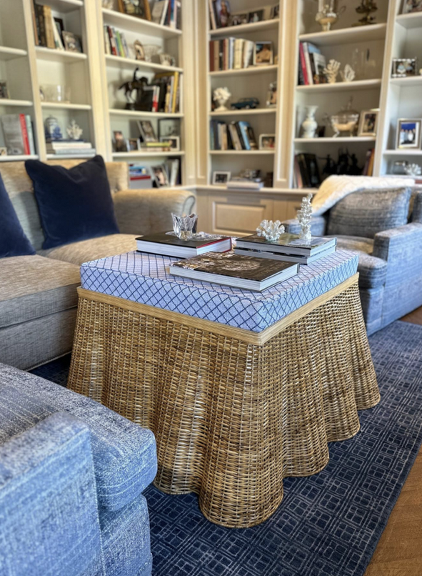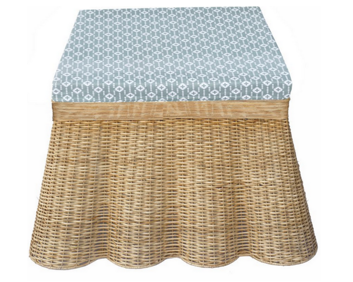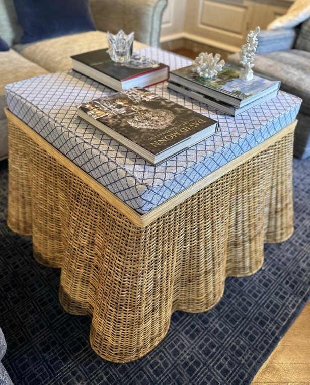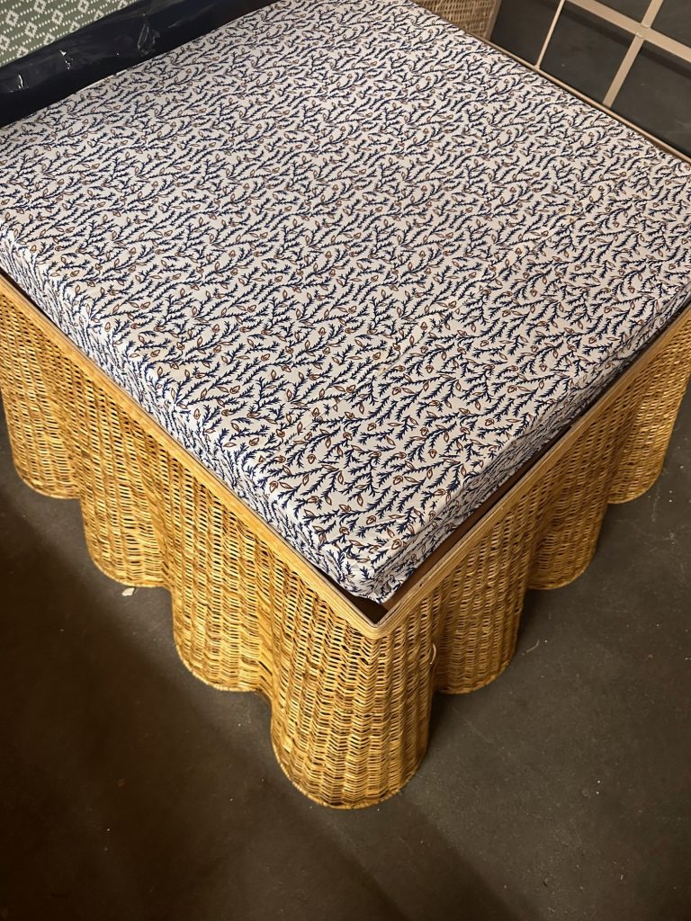 ITEM 16 We are down to the last two of these fabulous square scalloped coffee tables/stools with cushion. This is a beauty, they are in perfect condition. They come with a plush 6″ cushion. The scalloped detailing is on the entire body of the this beautiful piece.Being sold at 70% off of original price! These have to ship freight.
