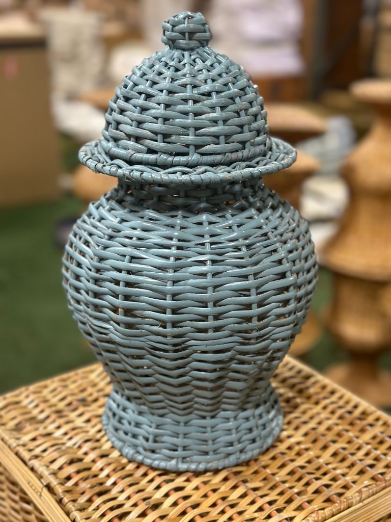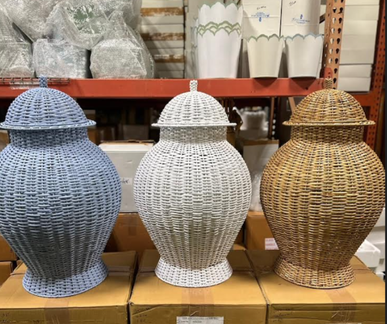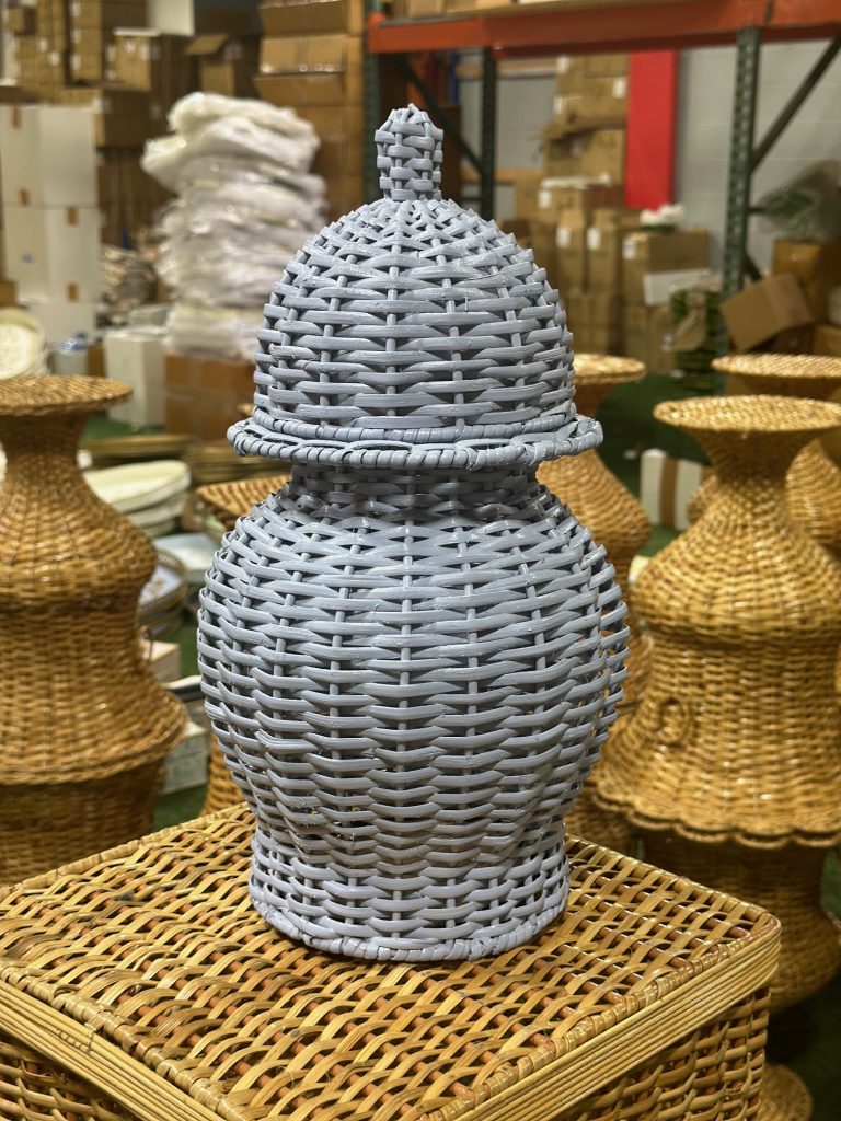 ITEM 19 Down to eh last batch of these jumbo and I do mean jumbo wicker jars! So smitten with our new jumbo wicker ginger jars! I cannot wait to start decorating with these bad boys. I am seeing them indoors of course but love the idea of seeing them outside, big enough to use on the ground for the wow factor. If you are having a party or event, these will absolutely be the star of the show!