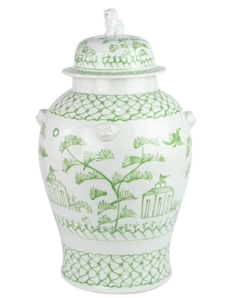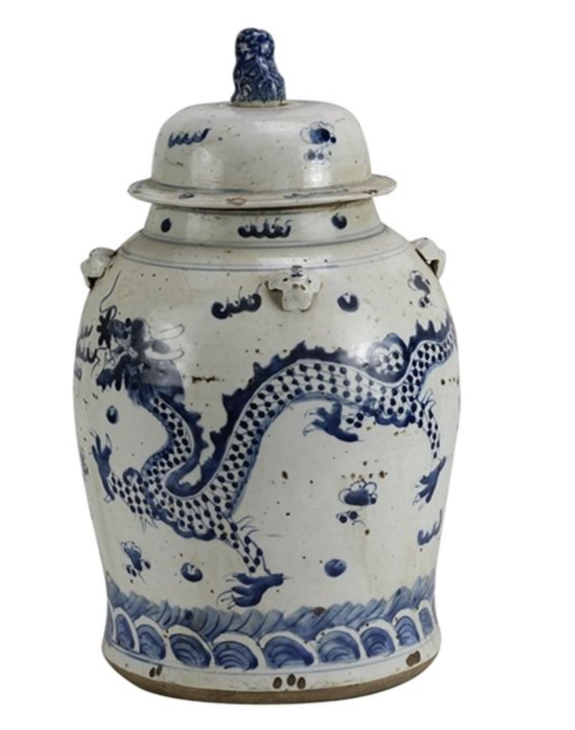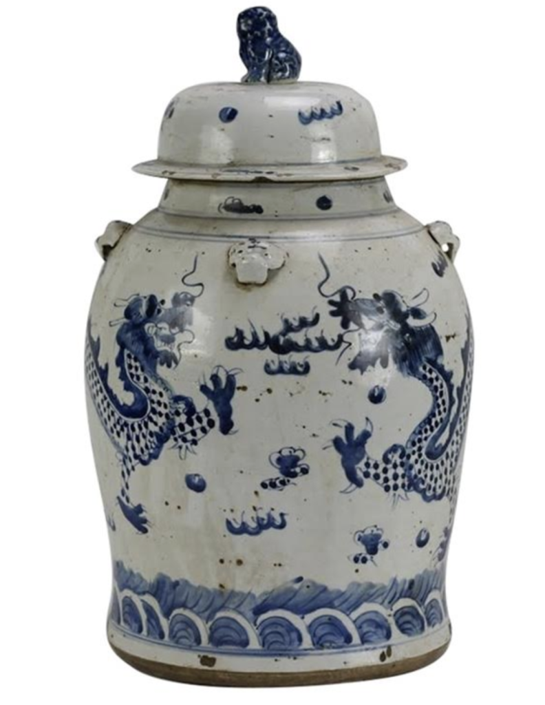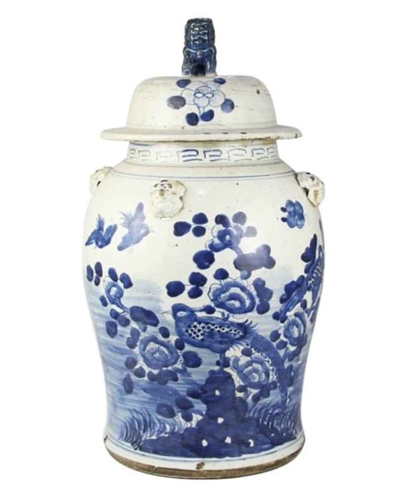 ITEM 16 Definitely one of our best selling items across the board is this incredible antiqued bird ginger jar with raised doe tailing and a charming foo dog lid. Ginger jars don’t get any prettier!