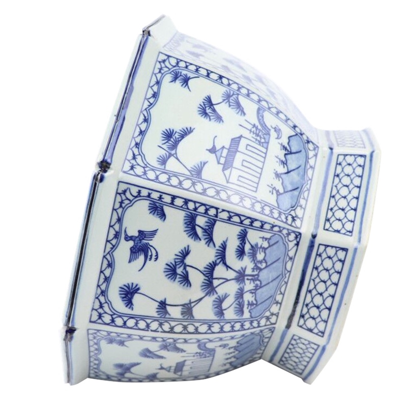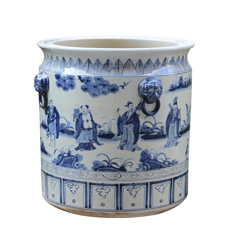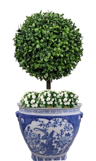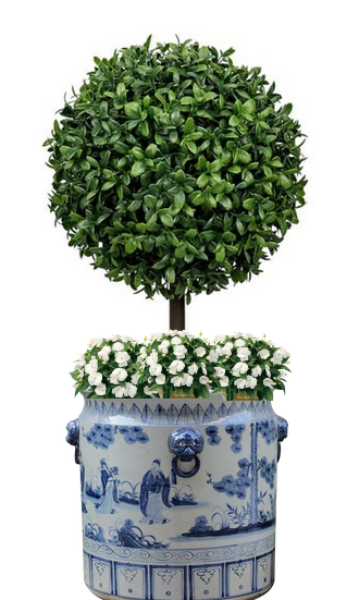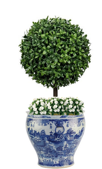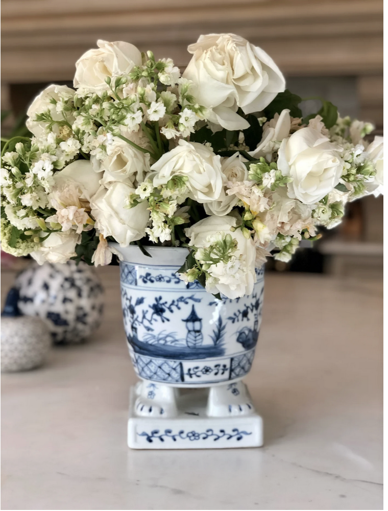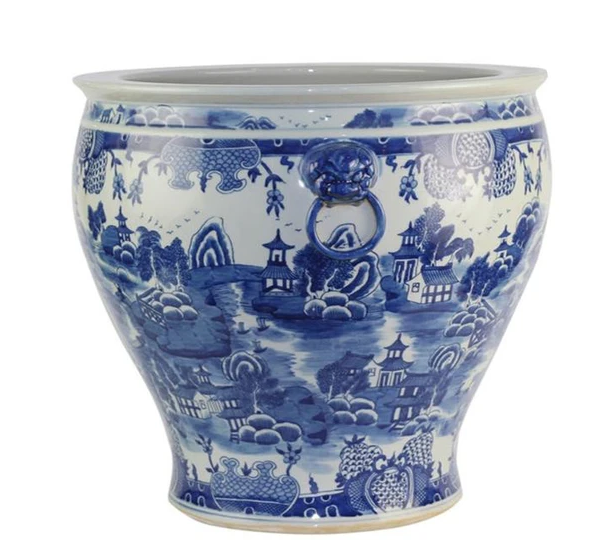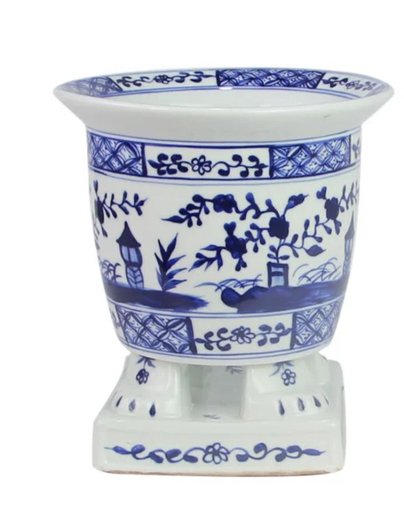ITEM 21 One of my favorite footed planters which I personally use all the item is painted with a charming village scene and rest on four delicate feet. Great size and ideal for topiaries, fresh flowers, boxwood balls, etc…Comes in two colors of blue. These just came in and are available to ship now.