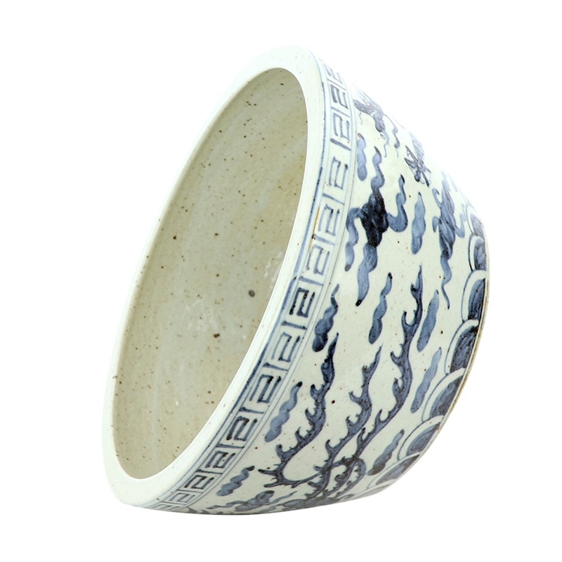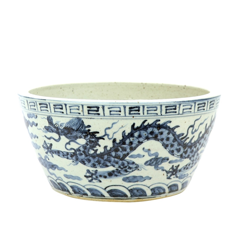 ITEM 17 Beautiful midsized dragon bowl. Beautiful to use as a centerpiece blow or as as vessel for flowers and orchids. A beautifully antiqued piece with a classic dragon scene.