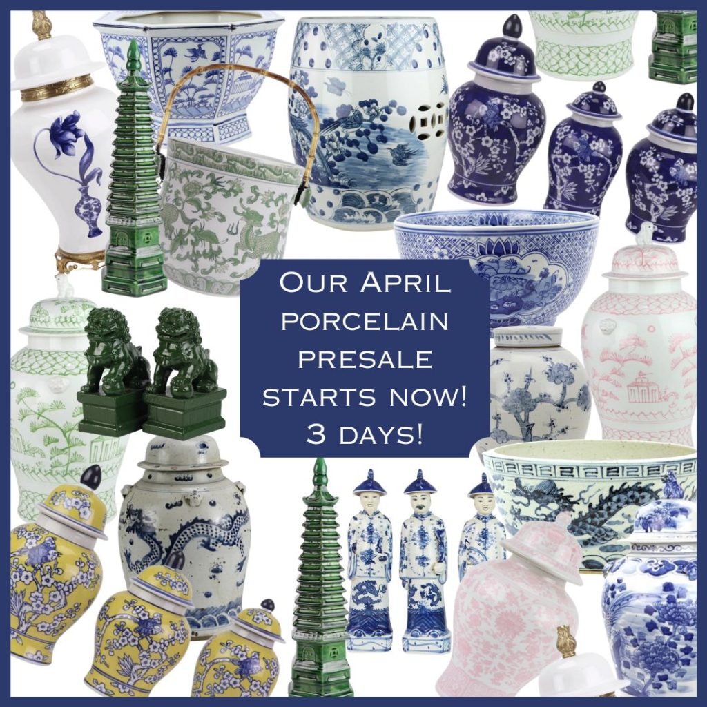 This porcelain presale is long overdue!  And this is a good one, featuring our anticipated ginger jar canister sets, the return of many long sold items and a few new things too.This shipment is on the way and due here around end of April. If you are familiar with these sales then you can jump right to sale if not please read over the rules below including a new and very easy way to checkout.