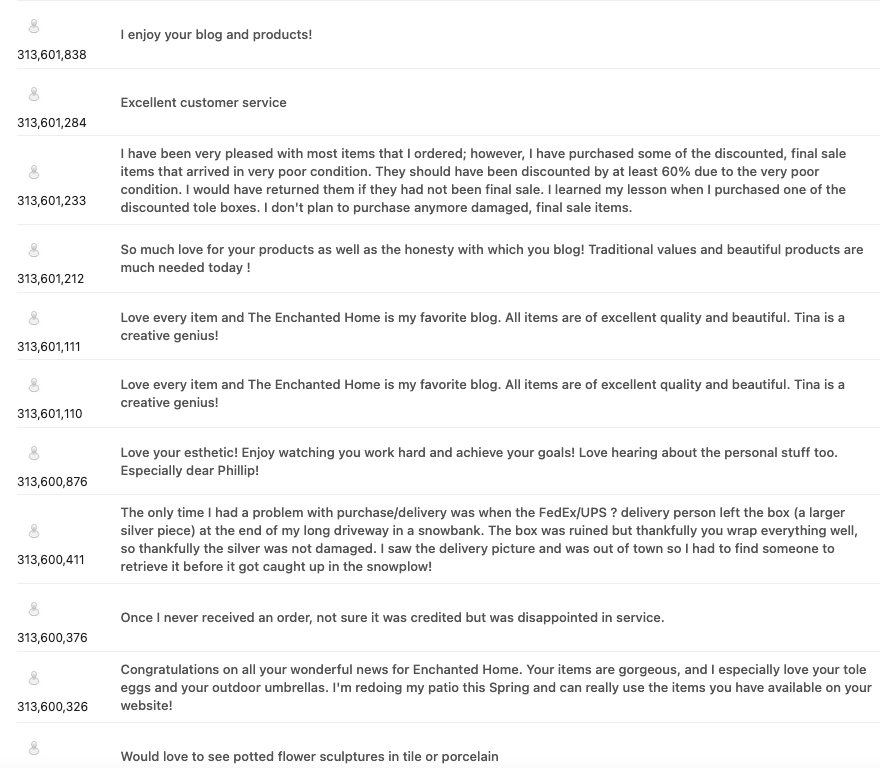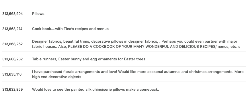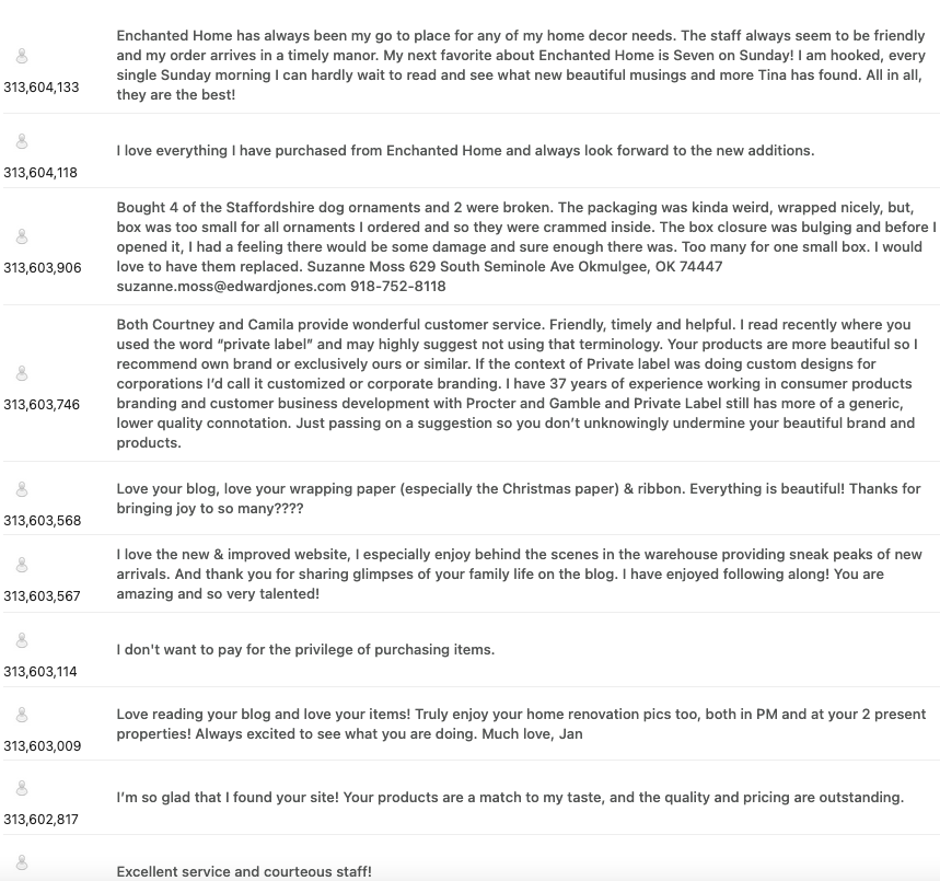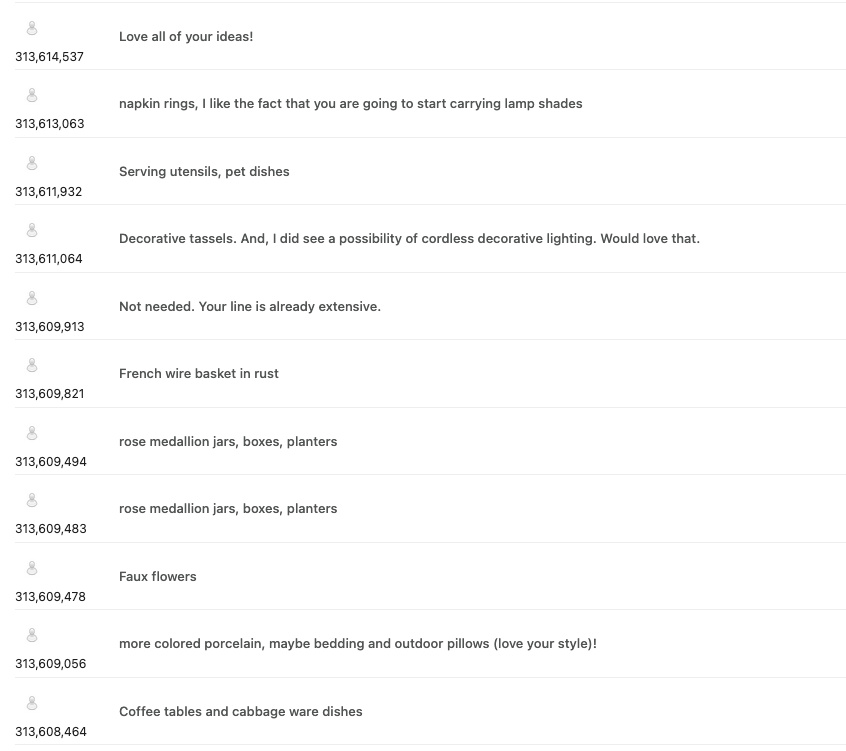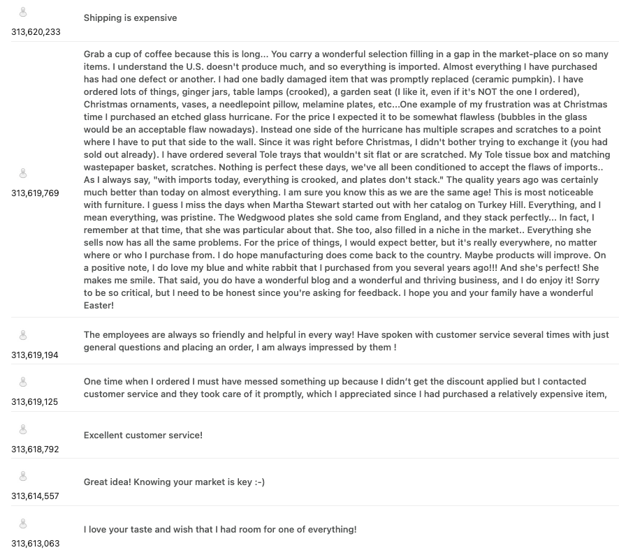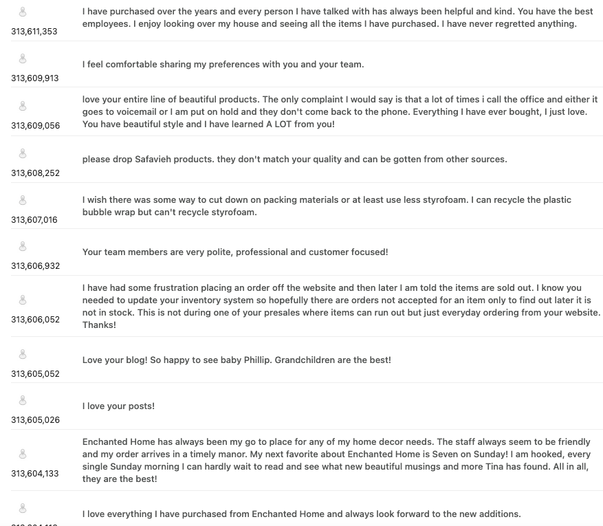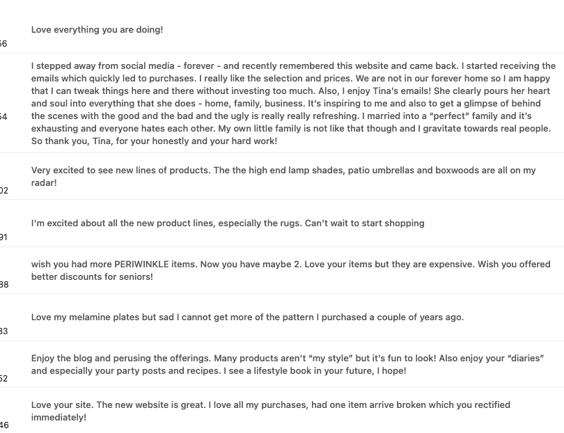 Overall, I’d say this was a fantastic report card, and it really validated what I do. I was so proud as I read through the responses! I loved all of the suggestions. Of course, we’re being very strategic about how we expand our product offerings—there’s so much that goes into that process. It’s not just about having a great idea, but making sure it’s something unique in the marketplace, cost-effective in today’s increasingly unpredictable world of imports and exports, and ultimately something that fits within our brand. But rest assured, I take note of everything you suggest, and who knows—some of these ideas may come to fruition down the line!