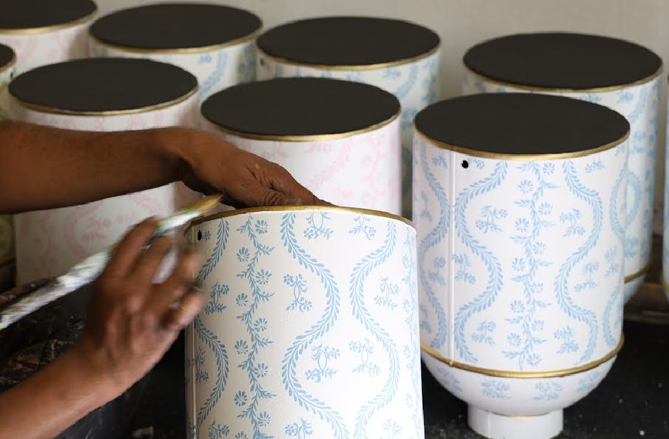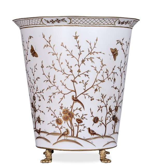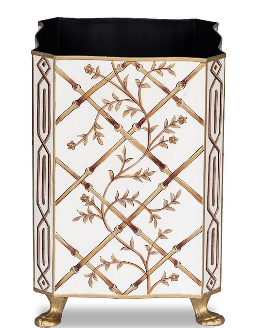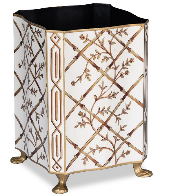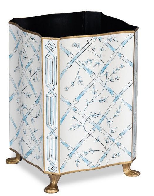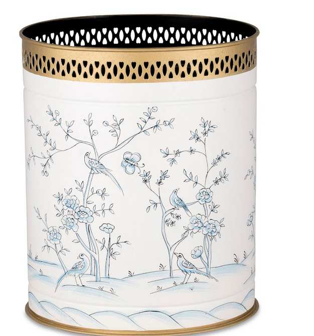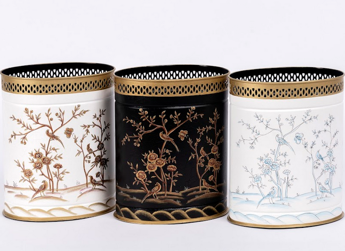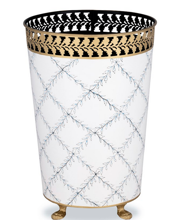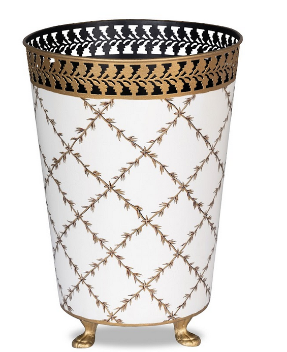ITEM 12 Our classically beautiful tall trellis wastepaper baskets with pierced trim are beauties! We can’t stock these fast enough, beautiful design that can fit easily into any decor. Offered in three colorways. The metal pierced work is really fabulous and elevates these pieces.