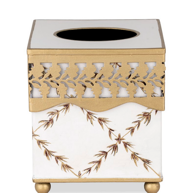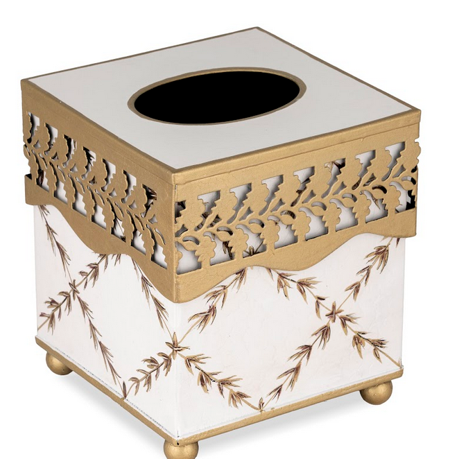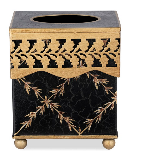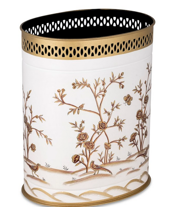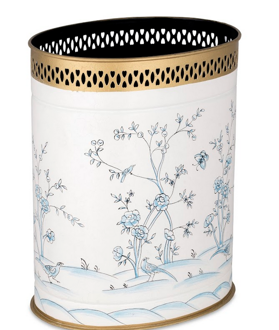 ITEM 9 One of our best sellers is our fabulous chinoiserie oval wastepaper basket with elegant detailed pierced metal border. Also has matching tissue, what a way to elevate a space!