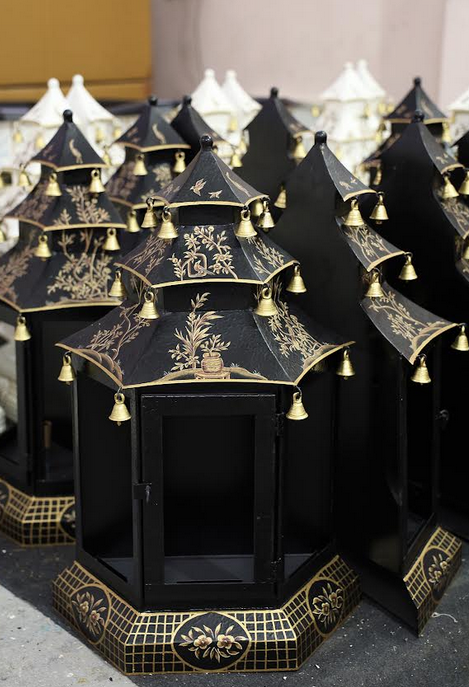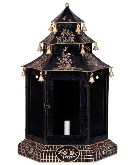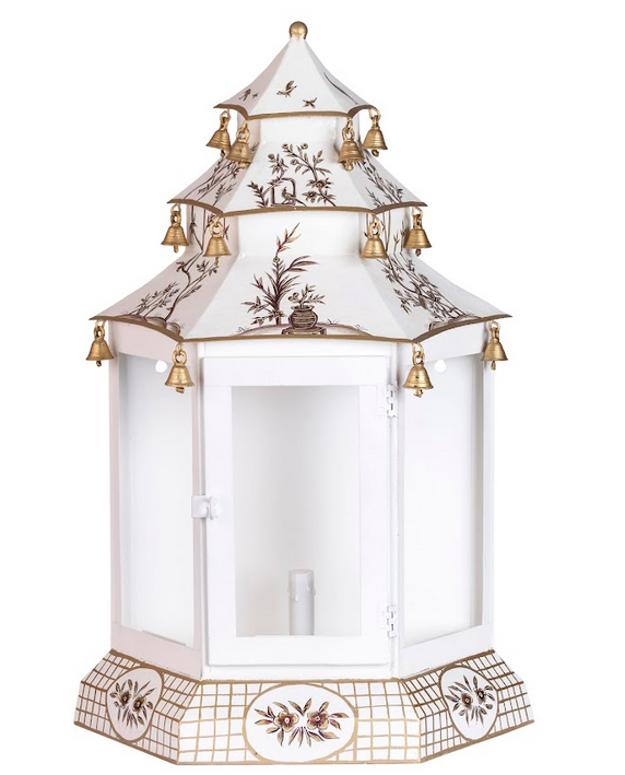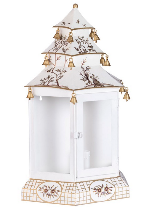 ITEM 11  LIMITED EDITION! These pagodas sconces are “next level” if you are looking to make a truly beautiful statement then look no further. These tall pagodas sconces are incredible offered in two colors. Hand painted with a chinoiserie scene featuring charming little bells. Electrified and ready to hang!