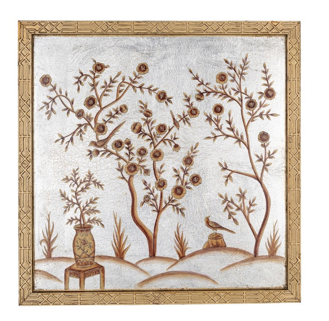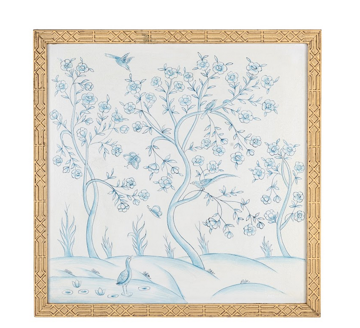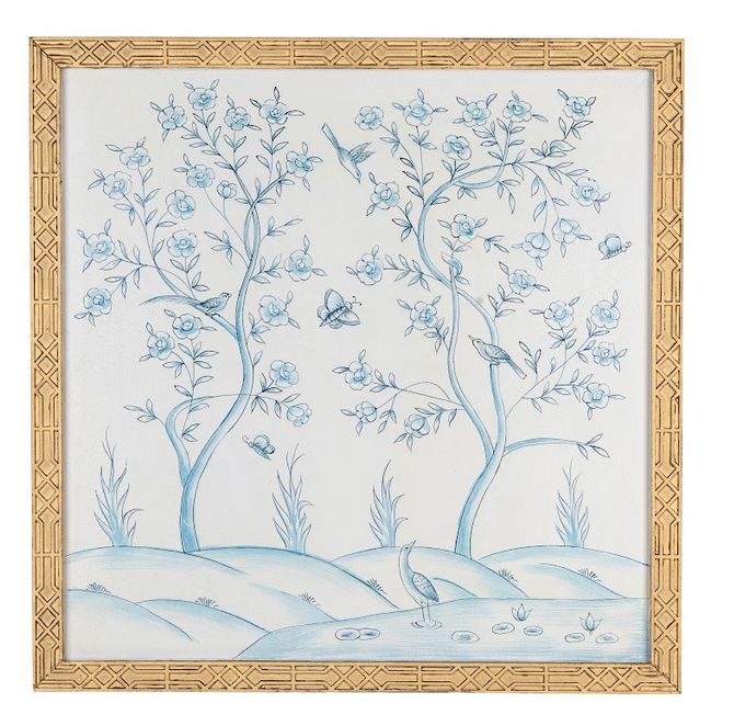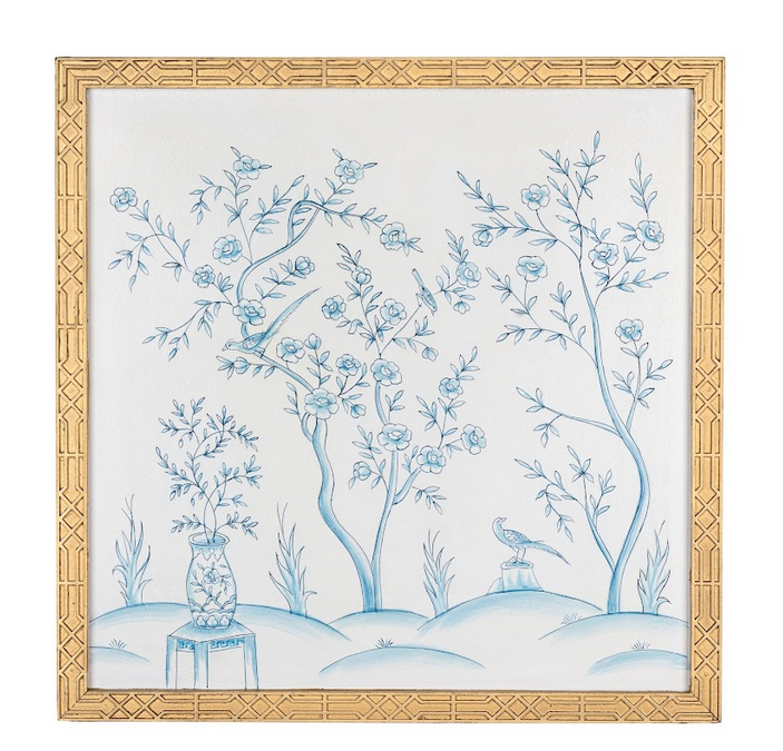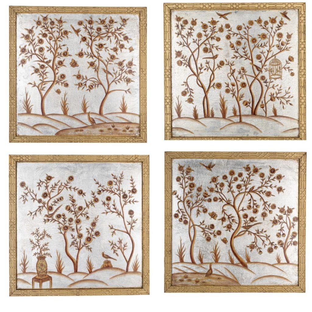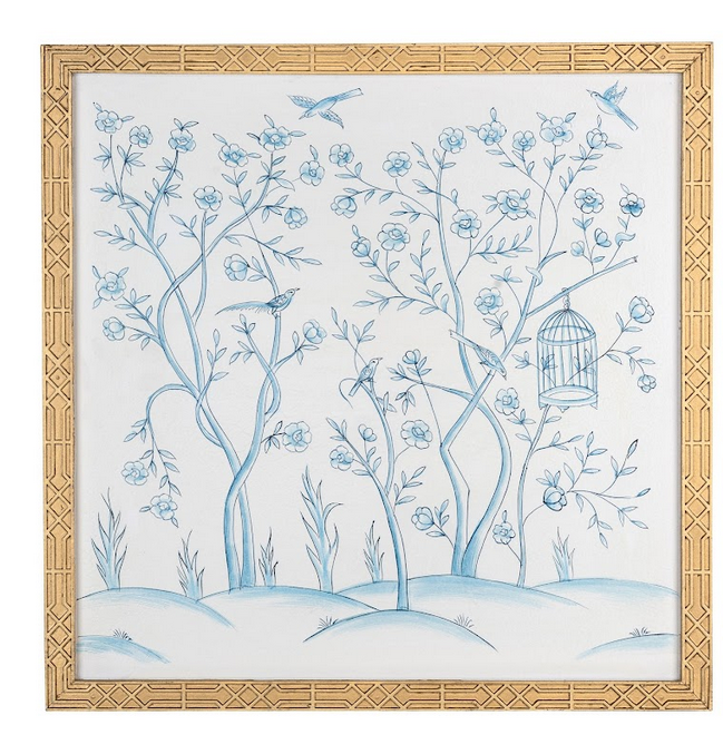 ITEM 14  Coming back by popular demand! You asked and we are deceiving these incredible hand painted chinosierie square murals in a wood fretwork frame are coming back int he three best selling colorways….cannot wait to take some home! These make instant statements on any wall. Love them as a set of 4 if space allows or a pair. Sold individually, pair or st of four