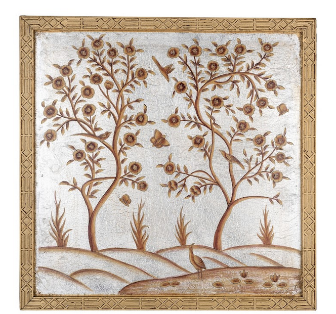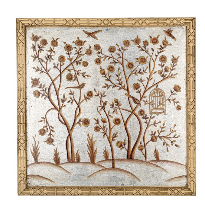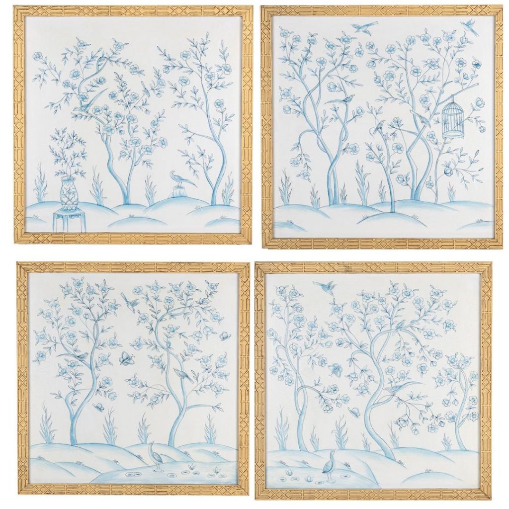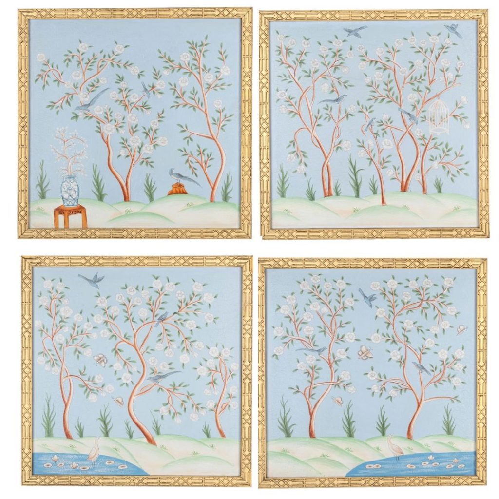 ITEM 14  Coming back by popular demand! You asked and we are deceiving these incredible hand painted chinosierie square murals in a wood fretwork frame are coming back int he three best selling colorways….cannot wait to take some home! These make instant statements on any wall. Love them as a set of 4 if space allows or a pair. Sold individually, pair or st of four