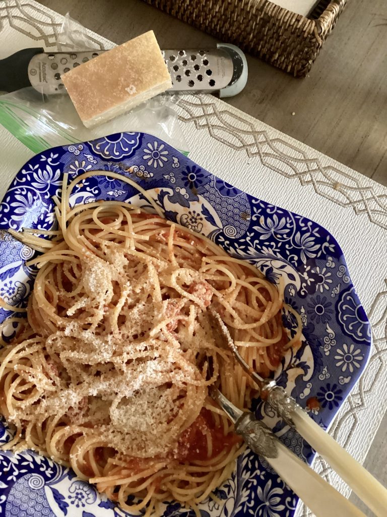 To Leslie who inquired about the recipe: Fresh spaghetti ( cook 5-8 minutes) or De Cicco boxed spaghetti, (cook 10-15 minutes), homemade tomato sauce or Carbone in a jar, pecorino (sheeps’ milk for those allergic to cows’ milk,) or parmigiano reggiano (imported both.) to top it off. Buon appetito!