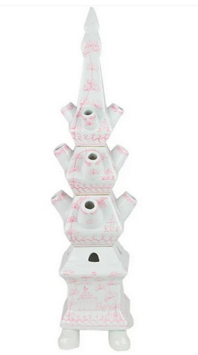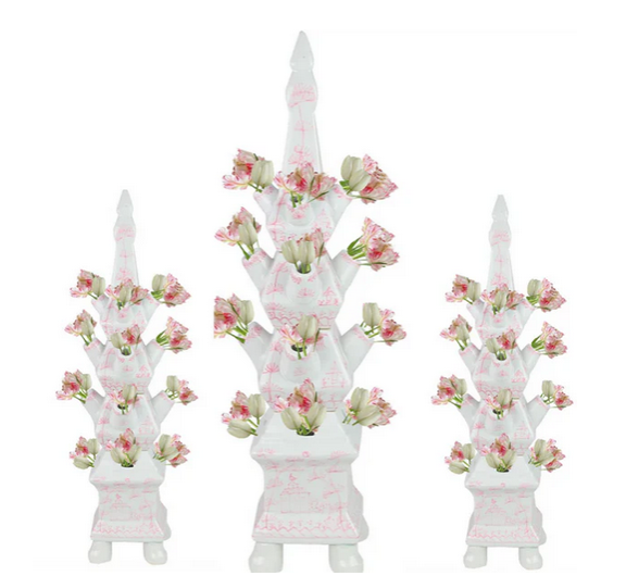 ITEM 22 Our fabulous pink/white tulipieres are so beautiful and the large is simply showstopping! Measures 32″ tall. This comes in four parts for easy access to adding water. Beautiful with flowers or without. Also works beautifully on mantles!