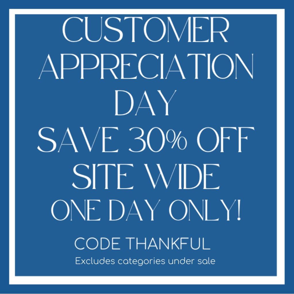 Don’t forget TODAY ONLY is our once a month Customer Appreciation Day! 30% off SITE WIDE!