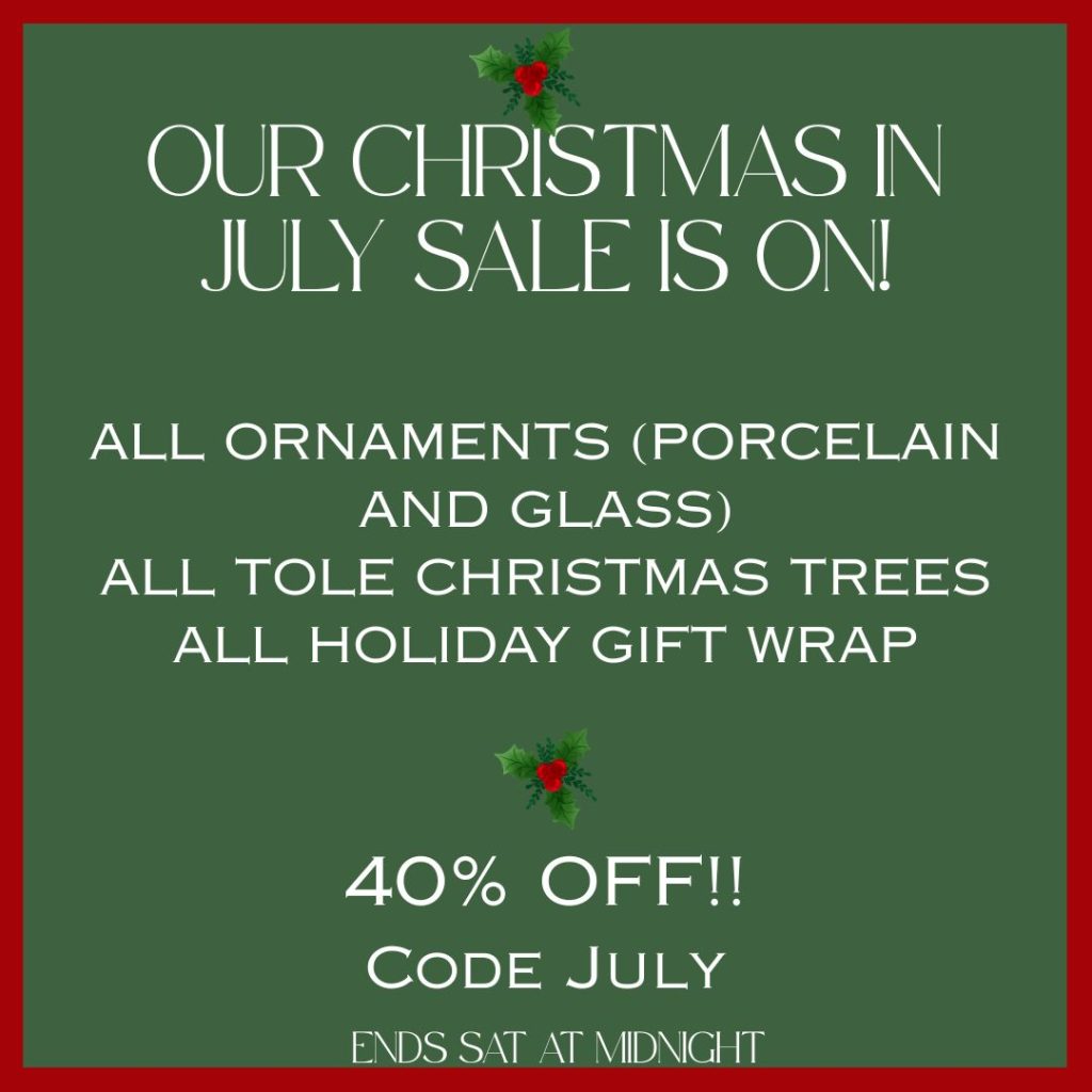 Don’t forget we are on day two of our July in Christmas sale… a fantastic time to stock up for the upcoming holiday season! Includes all holiday gift wrap, ornaments and holiday trees!
