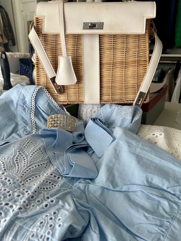 I paired it with this darling raffia bag and it a pair of flat gold sandals and it was a perfect summer outfit. This darling bag goes day to night.