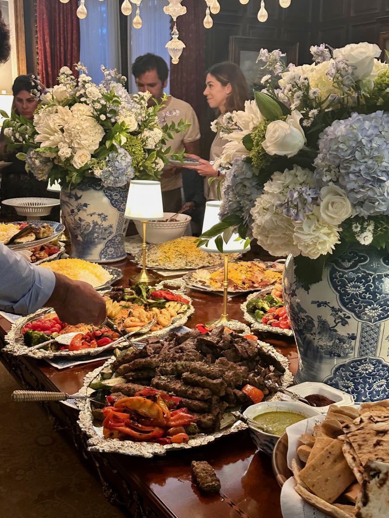 Where to look first? First, I am now starving seeing all that yummy food! Had Persian food for the first time in Los Angeles and you are not kidding- it is SO good. And that cake is a work of art! Wow. The flowers, the decor….everything! And you and Phillip stole the show- you both look incredible. What a cherub he is! This was fun, now off to find something to nibble on. Haha.