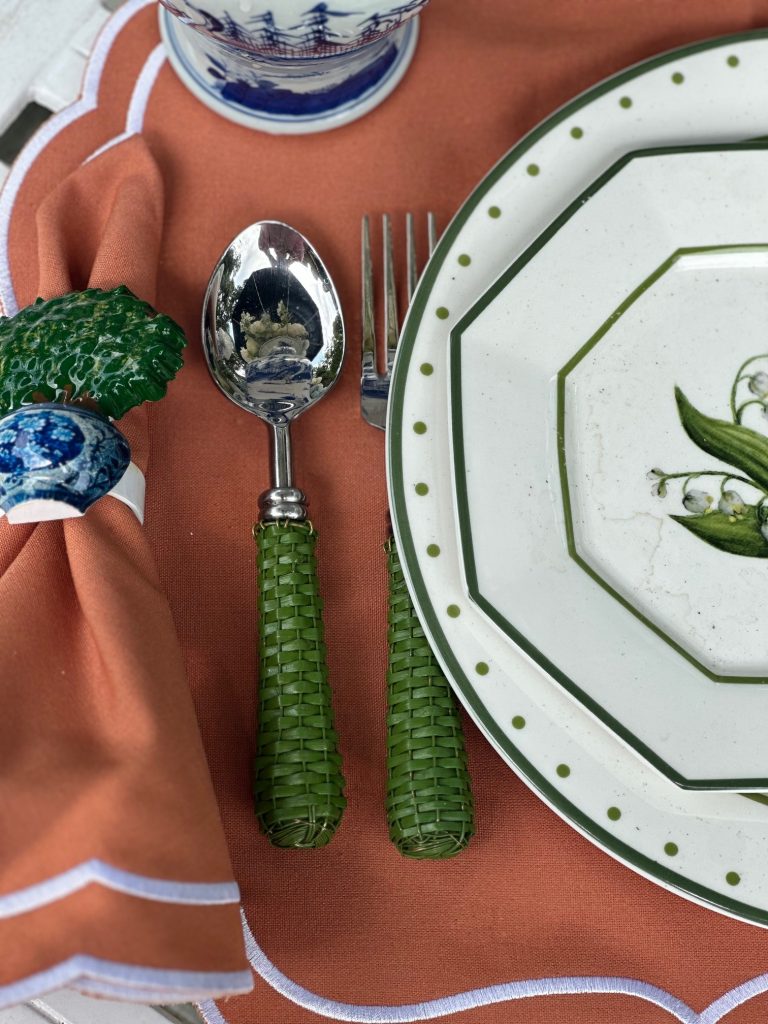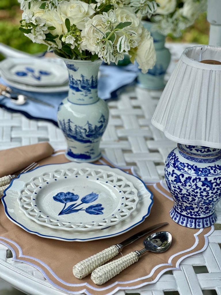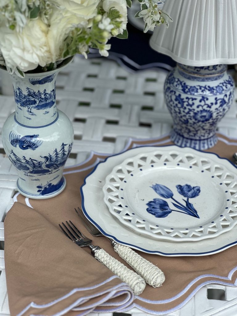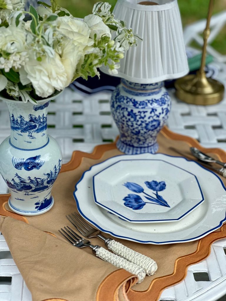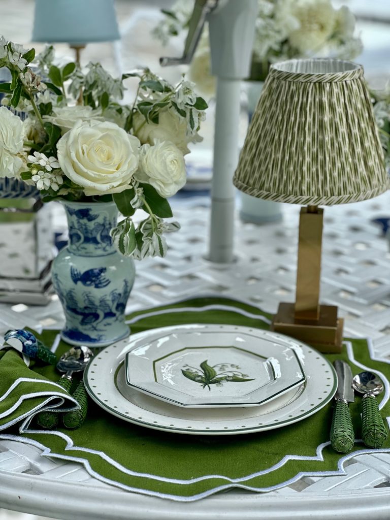 My china is white with a deep red rim and gold edge. I use my Stieff Rose sterling for setting a table with my plates. I am looking for a color in a placemat or tablecloth to use with my china. I usually use my white linen tablecloth and napkins. Seeing all your gorgeous colors in a table setting is making me doubt my red china. Can you pass along any ideas for adding color? Thank you so much! Big fan!!