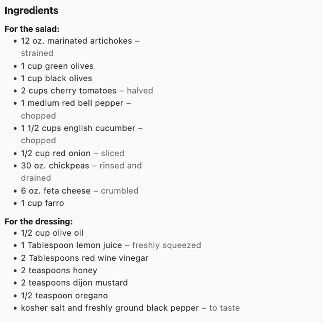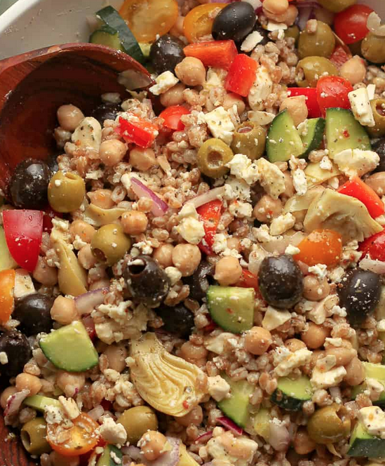 4 AN AMAZING FARRO GREEK SALAD This is sooo good! Great as a side with a BBQ, fish or chicken, can easily be a main dish as well. Super flavorful and always a hit!