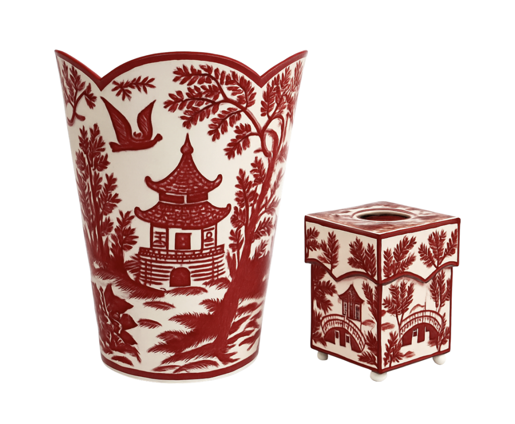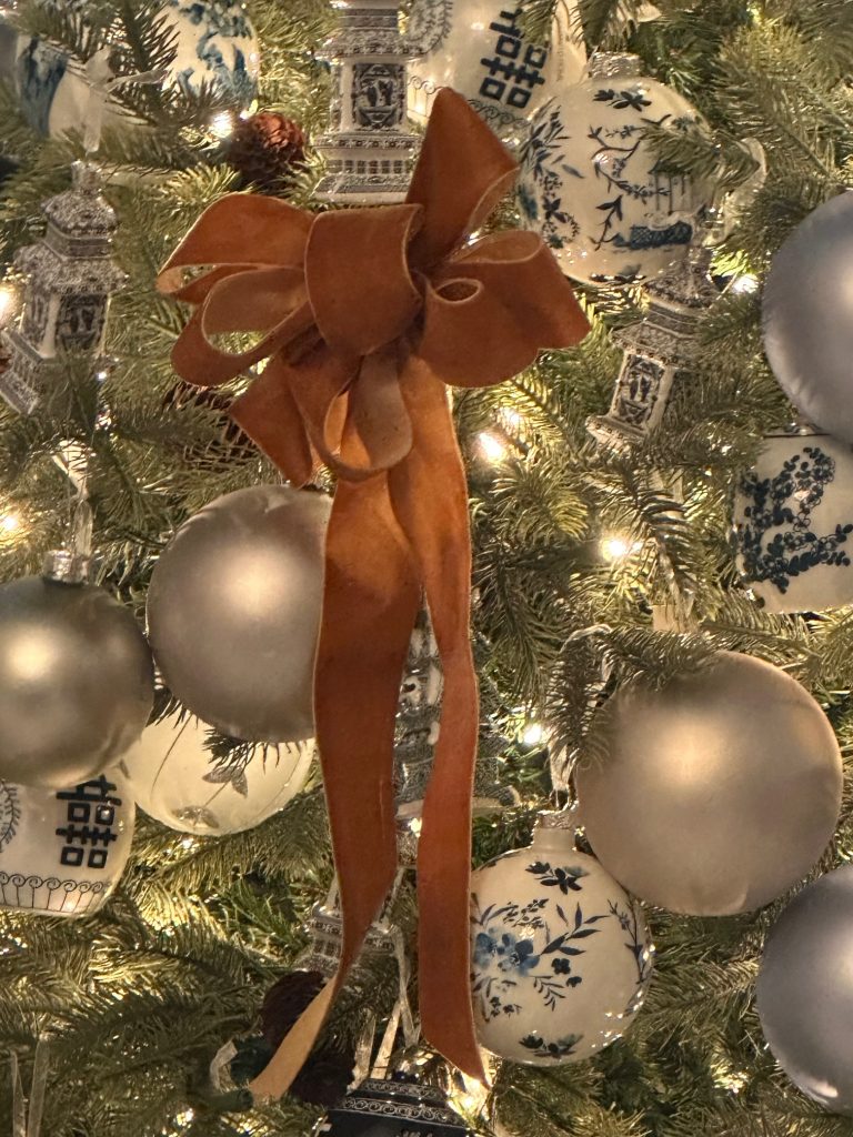 While I don’t celebrate Christmas, I do celebrate my own holidays and decorate for them. Being in love with design,I always enjoy seeing the celebrations and decorations of others, especially at Christmas. I just love the bow idea, and I love the color !! Having the bows, such a pretty element, all over the tree integrates it so well! So well done!!! And I just love the Pagoda wastebasket/ tissue group that is coming! Can’t wait !