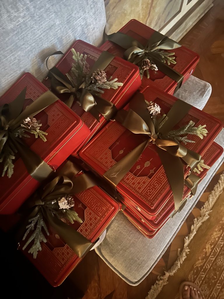 Packaged these beautiful tins of the yummiest crepe cookies as favors for our holiday cocktail party