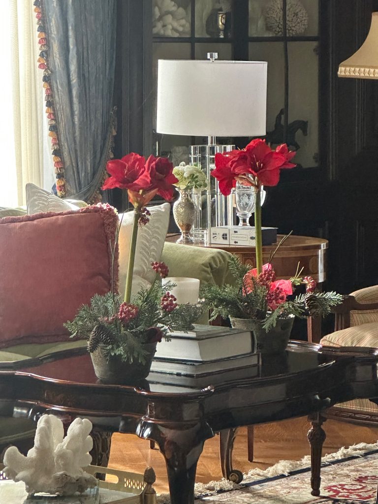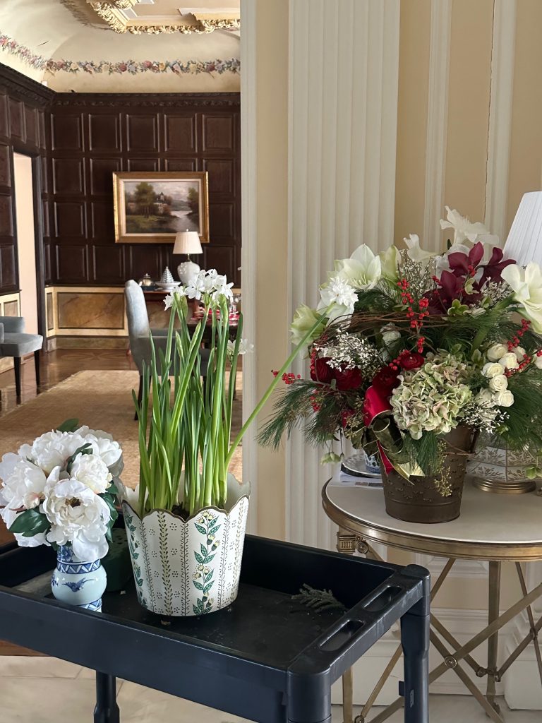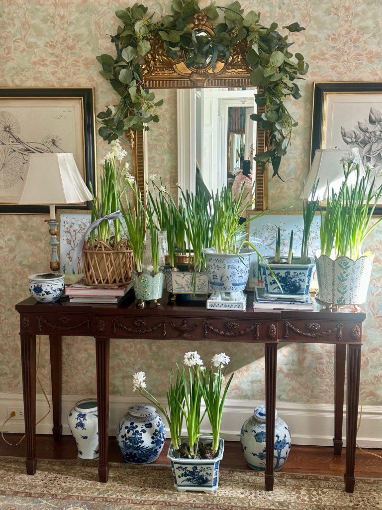 I unexpectedly ended up having a beautiful little paper white room, this is a small room off our foyer, everything in there was already where when we moved so I jazzed it up placing all my paper whites in all my containers there, and voila! This has become my favorite little room and it smells sooo good too!