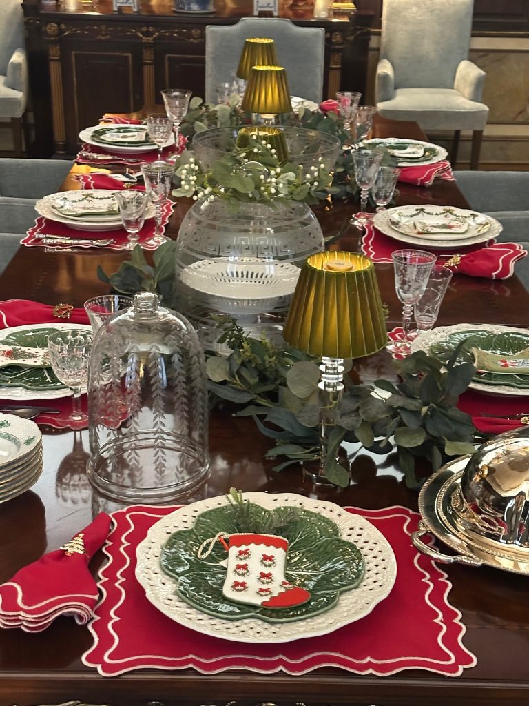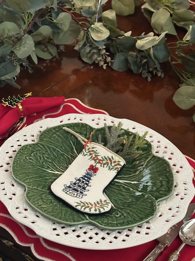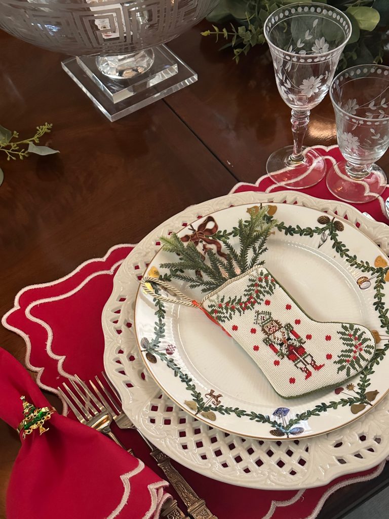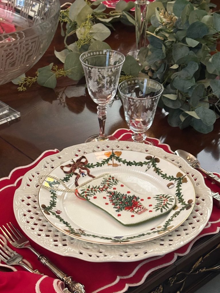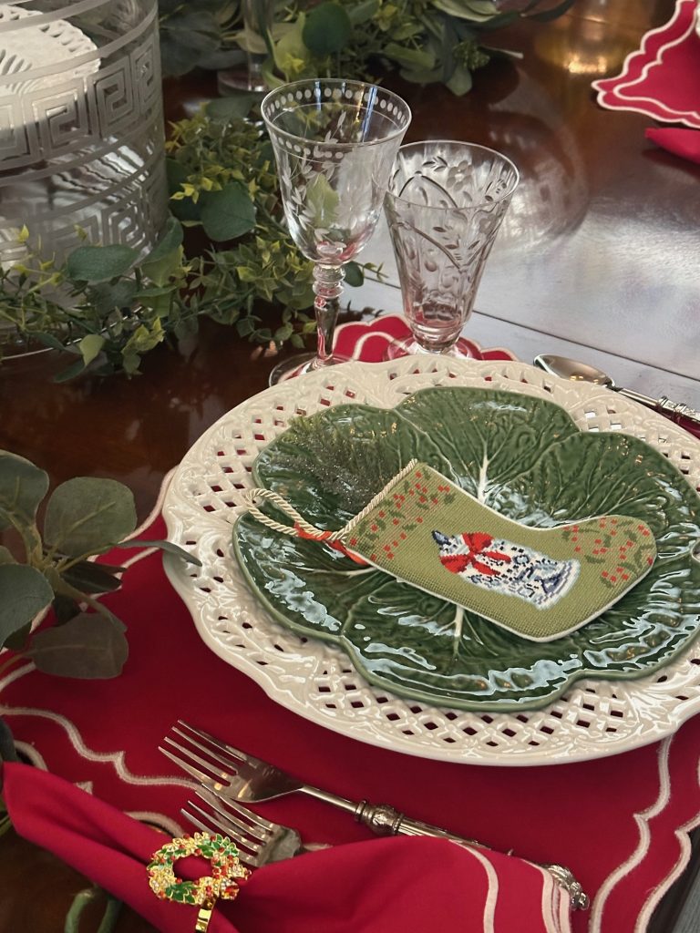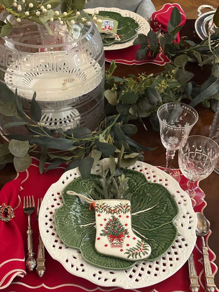 And our beautiful new stockings (both the minis and full size) and fabulous and new linens really “made” this table. As much of my china is packed away, had to use rotating patterns which actually looks. pretty festive!