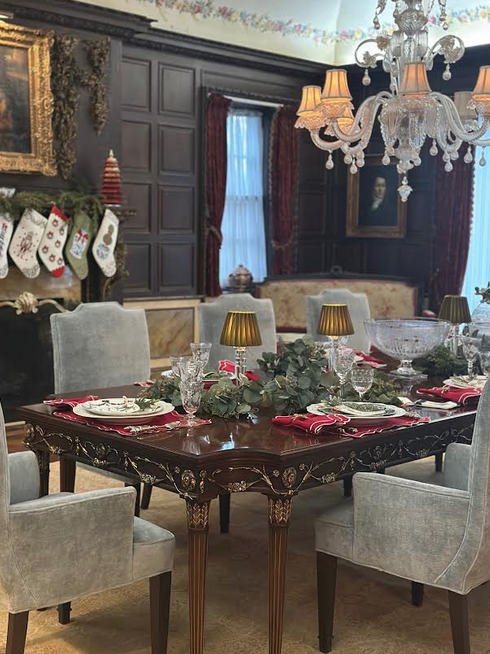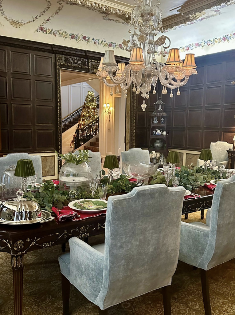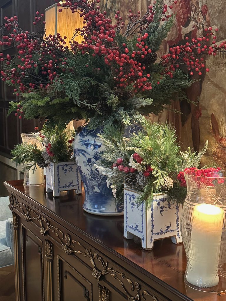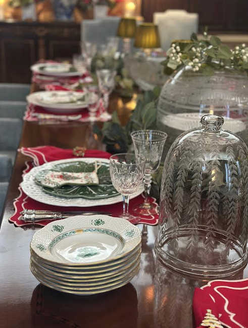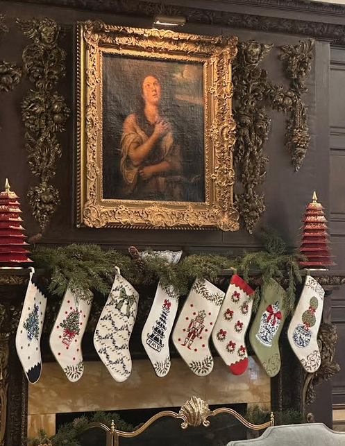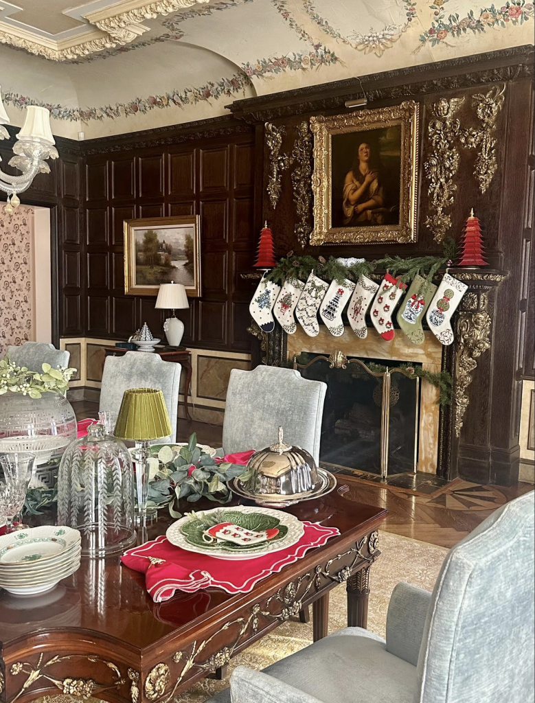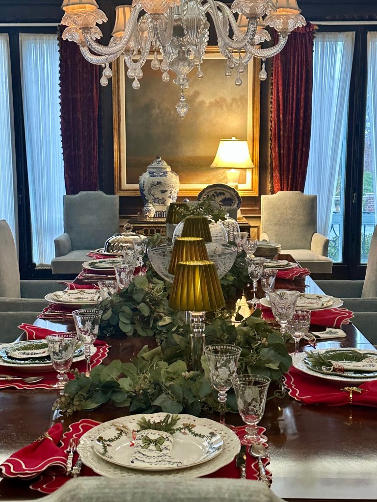 And our beautiful new stockings (both the minis and full size) and fabulous and new linens really “made” this table. As much of my china is packed away, had to use rotating patterns which actually looks. pretty festive!