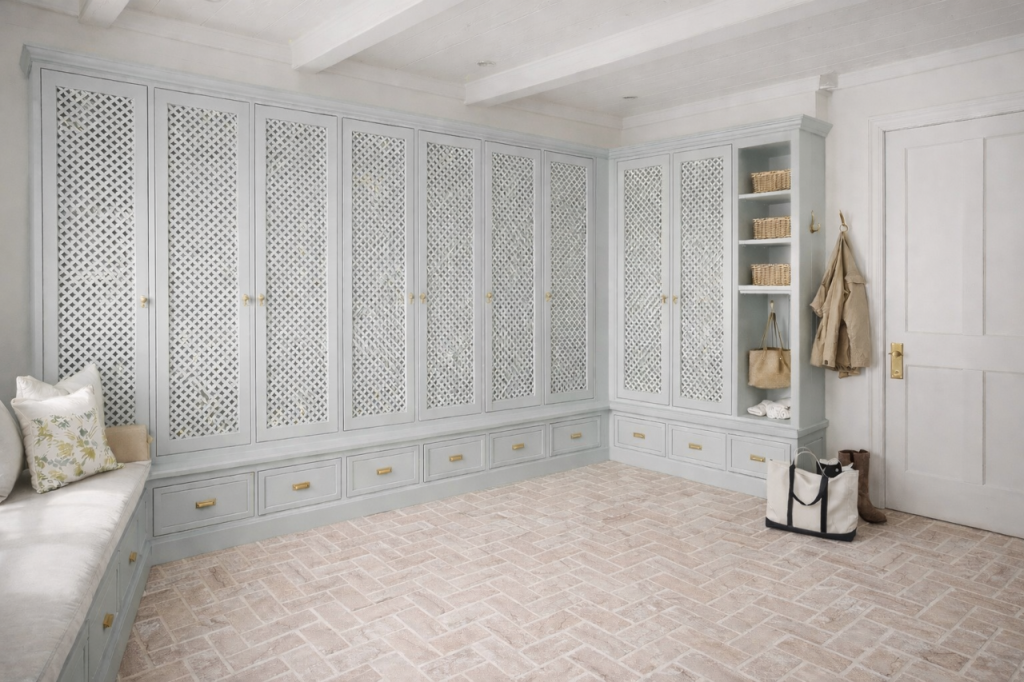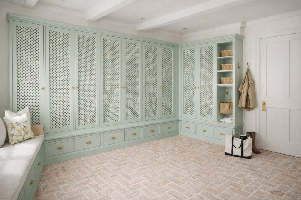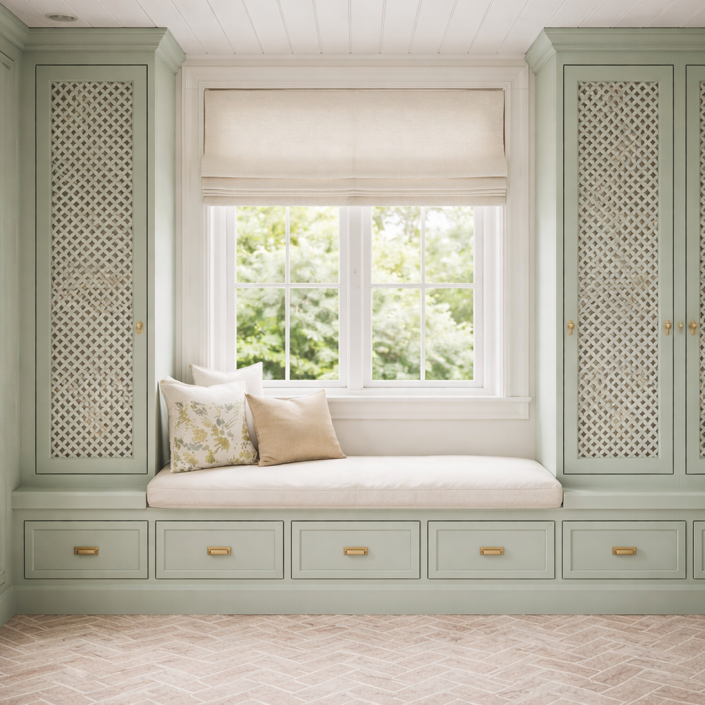 Hi Tina, First time chiming in with a comment. I like both the ivory or the light blue color for the mud room .While the light blue is a cool color, it never the less warms up the room compared to the ivory. I don’t care for the green. But here’s my biggest feeling about the room…. I really don’t care for the lattice. A lattice panel on either side of the window seat as a decorative feature I think would look very nice, and with the window seat would create a statement wall. But I find the entire adjacent wall of lattice cabinets to be too much. It makes be think of an outdated Florida room. Or, and I hate to say it, but I look at it in the images you posted and I think of a solid wall of cold air returns! I think beautifully painted solid wood panel cabinet doors would be much more attractive and more timeless.. Let the two panels flanking the window seat carry the day. Just two cents from a California Designer.