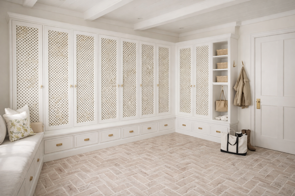 Next thing is the mudroom. I see lattice doors there with one wall of panels and hooks with drawers on bottom. I worked with a designer to create this mudroom and put it in AI and really love it. I put in three color options. Think I know which I will go with but its always fun to get our opinion too. I actually really like the brick herringbone floor but tried a few other flooring options as well.