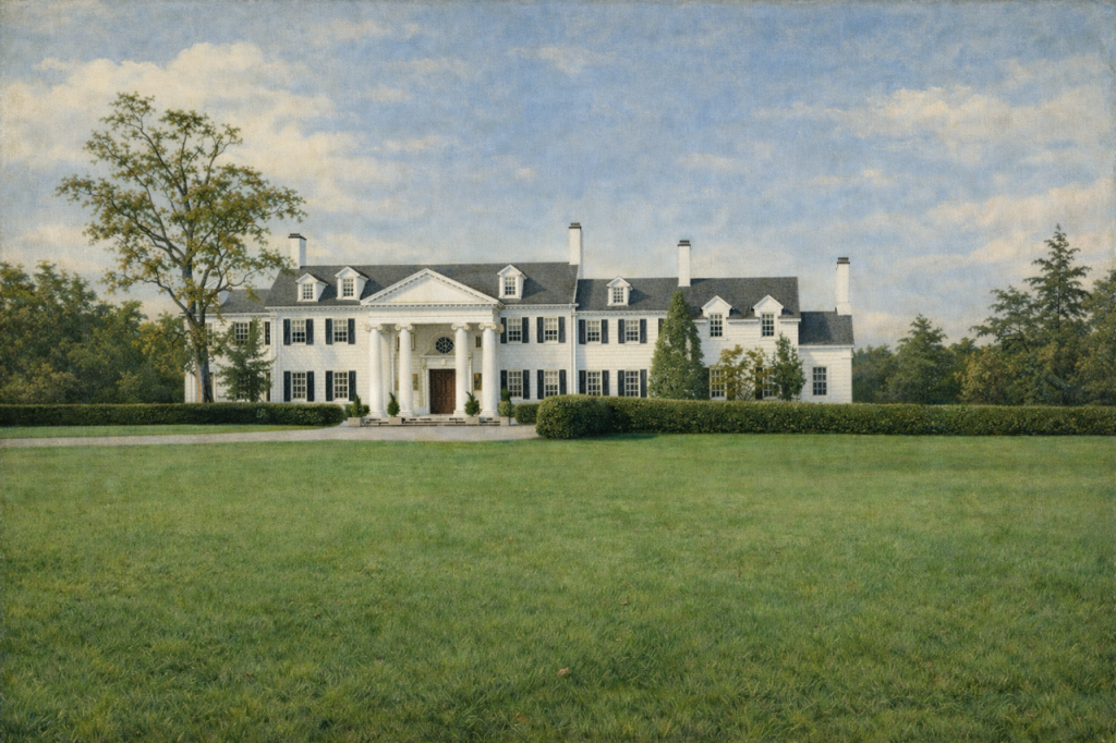 And here it is (as per AI) with the new portico/columns- (there is only one dormer on each side of portico, sometimes AI goofs)