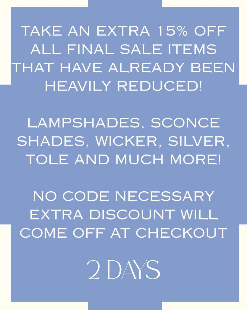 SECOND AND LAST DAY OF OUR LAST CALL/FINAL SALE CLEARANCE WHERE YOU GET TO TAKE AN EXTRA 15% OFF ALREADY HEAVILY REDUCED ITEMS!