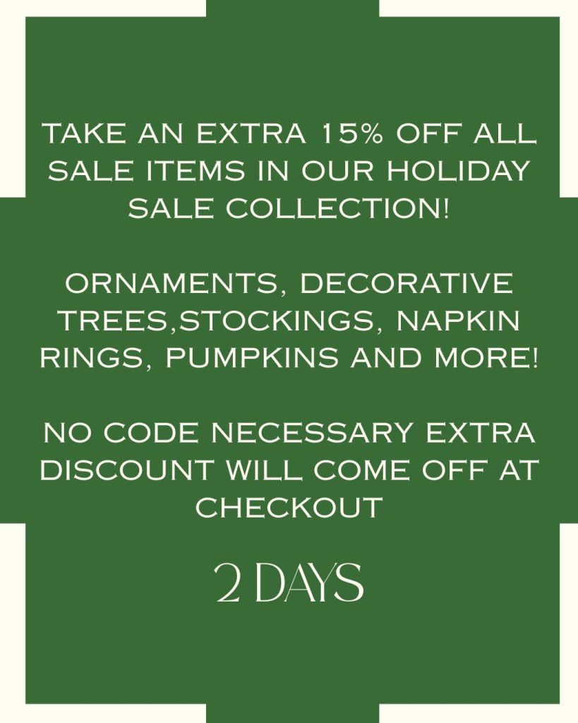 THIS IS BIG! BEFORE WE PUT THINGS AWAY-  TAKE AN EXTRA 15% OFF HOLIDAY (INCLUDES ORNAMENTS, TREES, NAPKIN RINGS, STOCKINGS, PUMPKINS) GREAT TIME TO STOCK UP FOR NEXT SEASON!