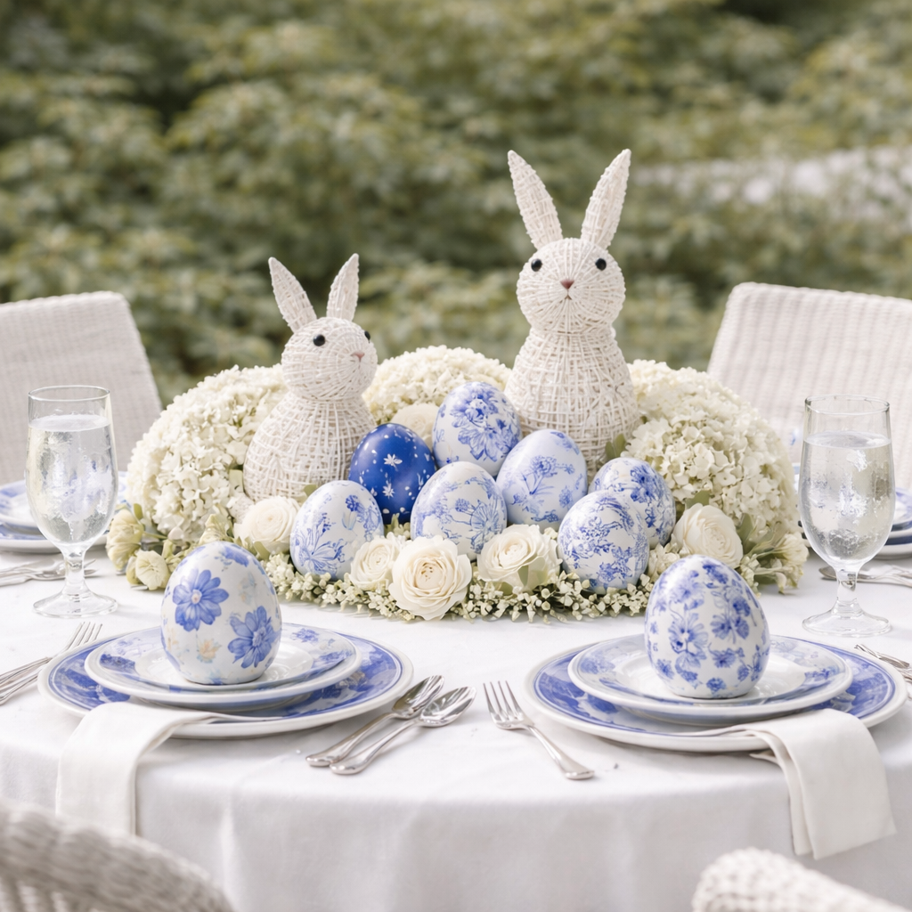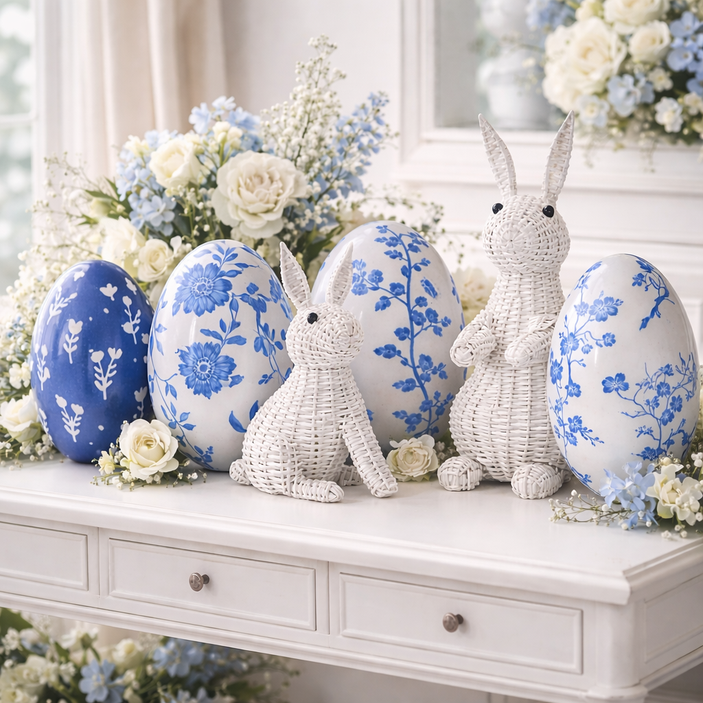 Of course I Loved the blue and white eggs! A basket of eggs on a coffee table or displayed with bunnies on the dining table are perfect!