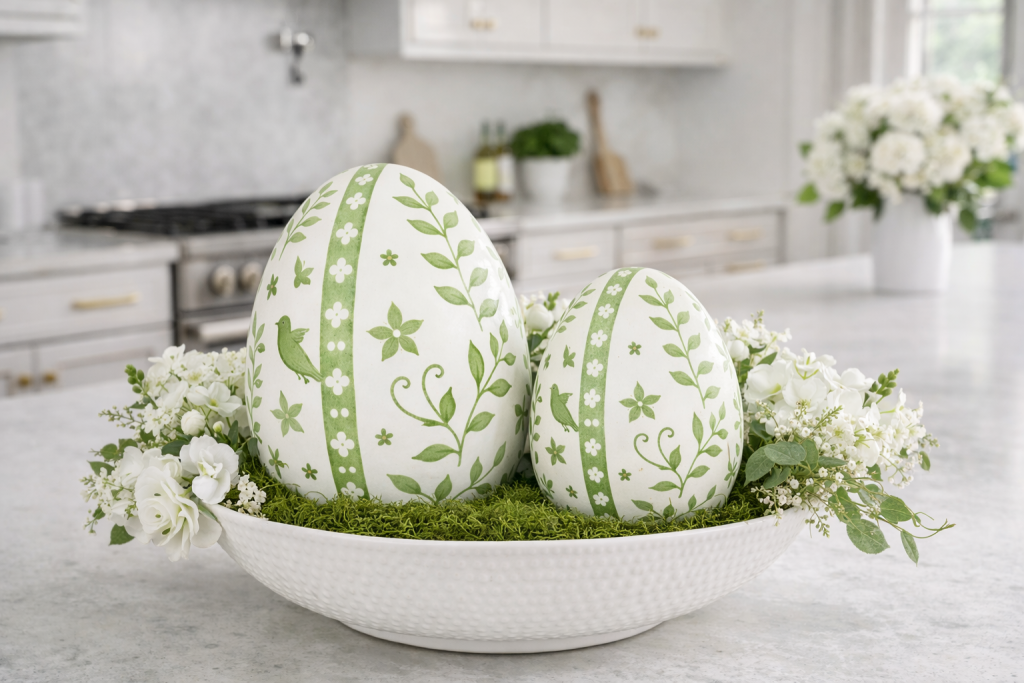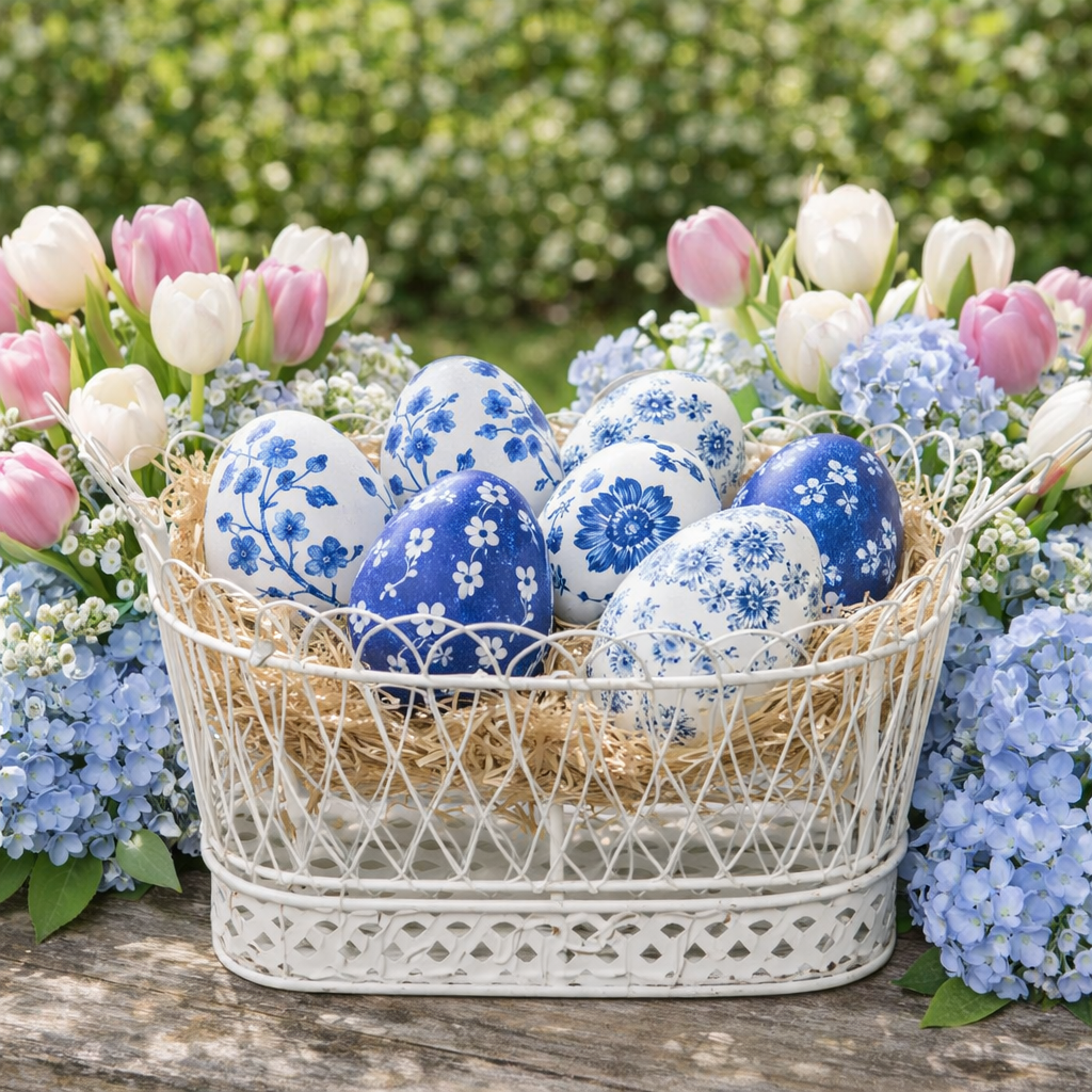 Since II am a blue and white gal, I would style the blue and white eggs with all of my blue and white chinoiserie.