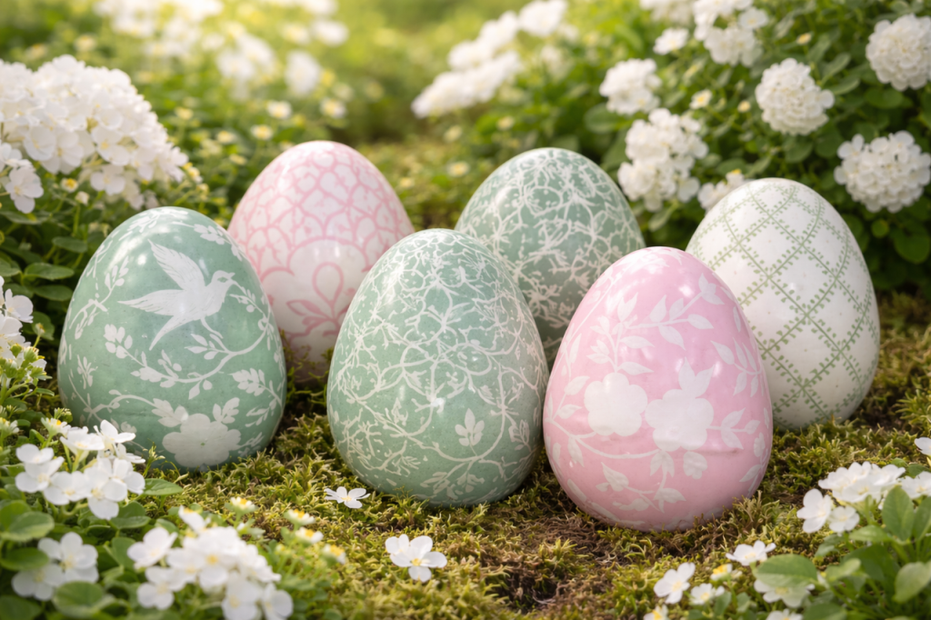 I love all the porcelain eggs, but I would choose the green with the bands around them. I would but them atop a grapevine wreath and lichen pieces with a large chocolate bunny. Then enclose this design under a large glass dome. I would tie velvet green and pink ribbon atop the dome.
