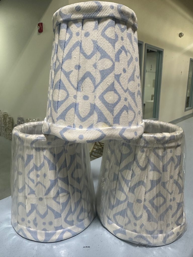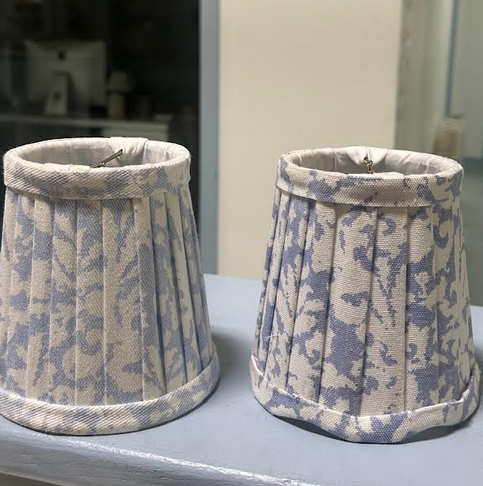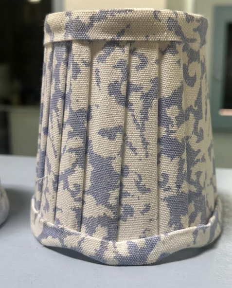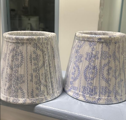 ITEM 4 Have five of the larger sconce shades left, one on right is more periwinkle, one on left is more of a dusty blue/light blue Great for a small lamp or large sconce. Clip on.