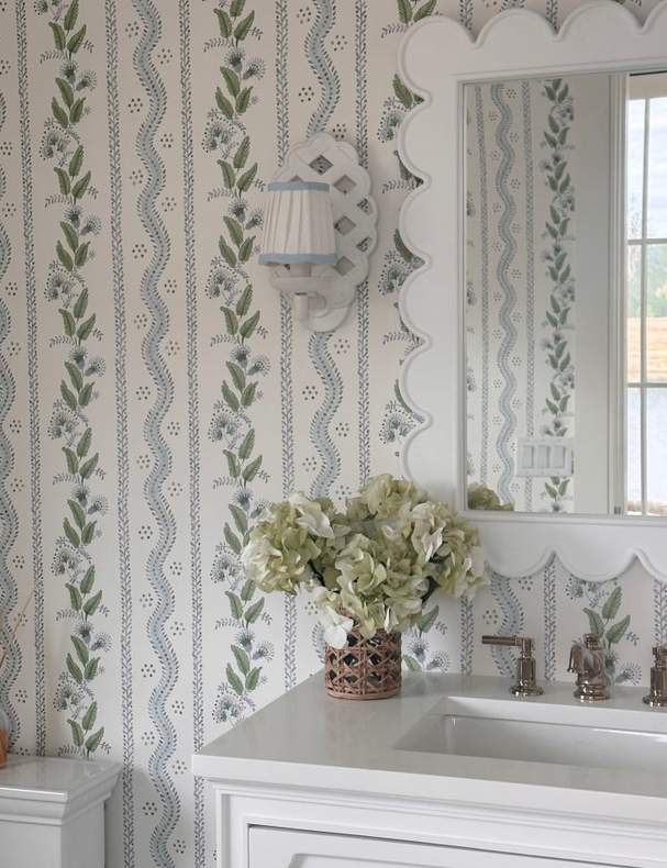 The lattice lamp sconces are divine and would be a spring refresh in my powder room. Thinking about another wicker pedestal too.