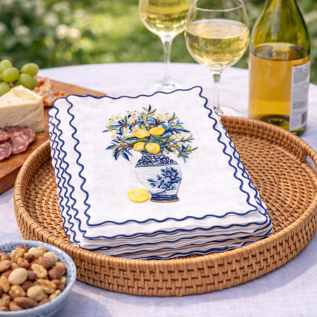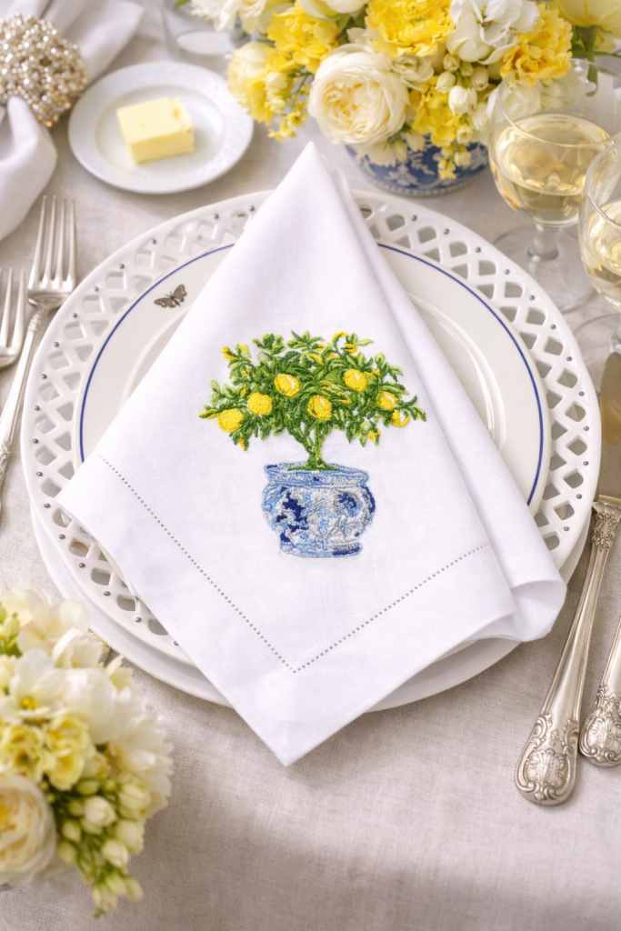 In love with the embroidered dinner/cocktail napkins! The lemon tree topiary and blue hydrangeas are my favs.Just in time for Spring and Summer!