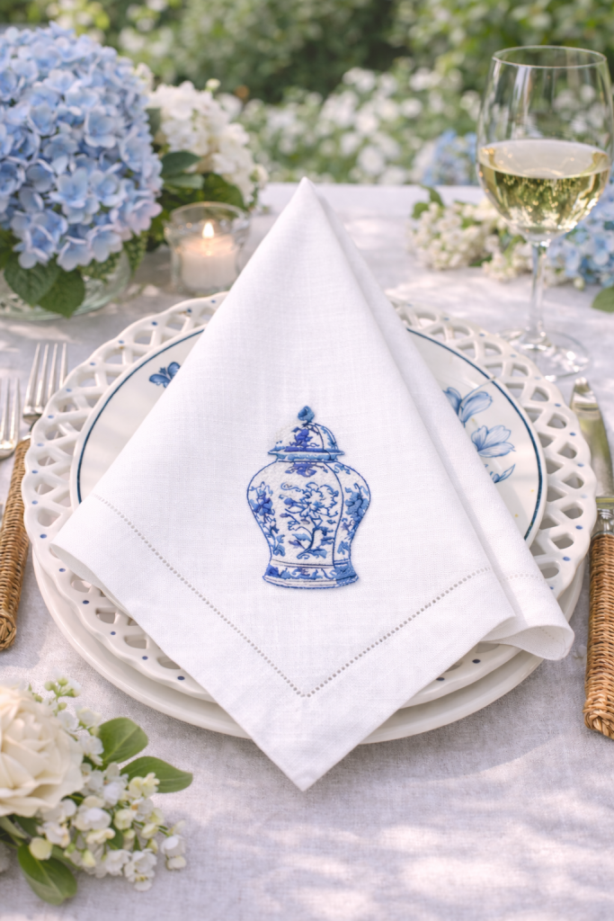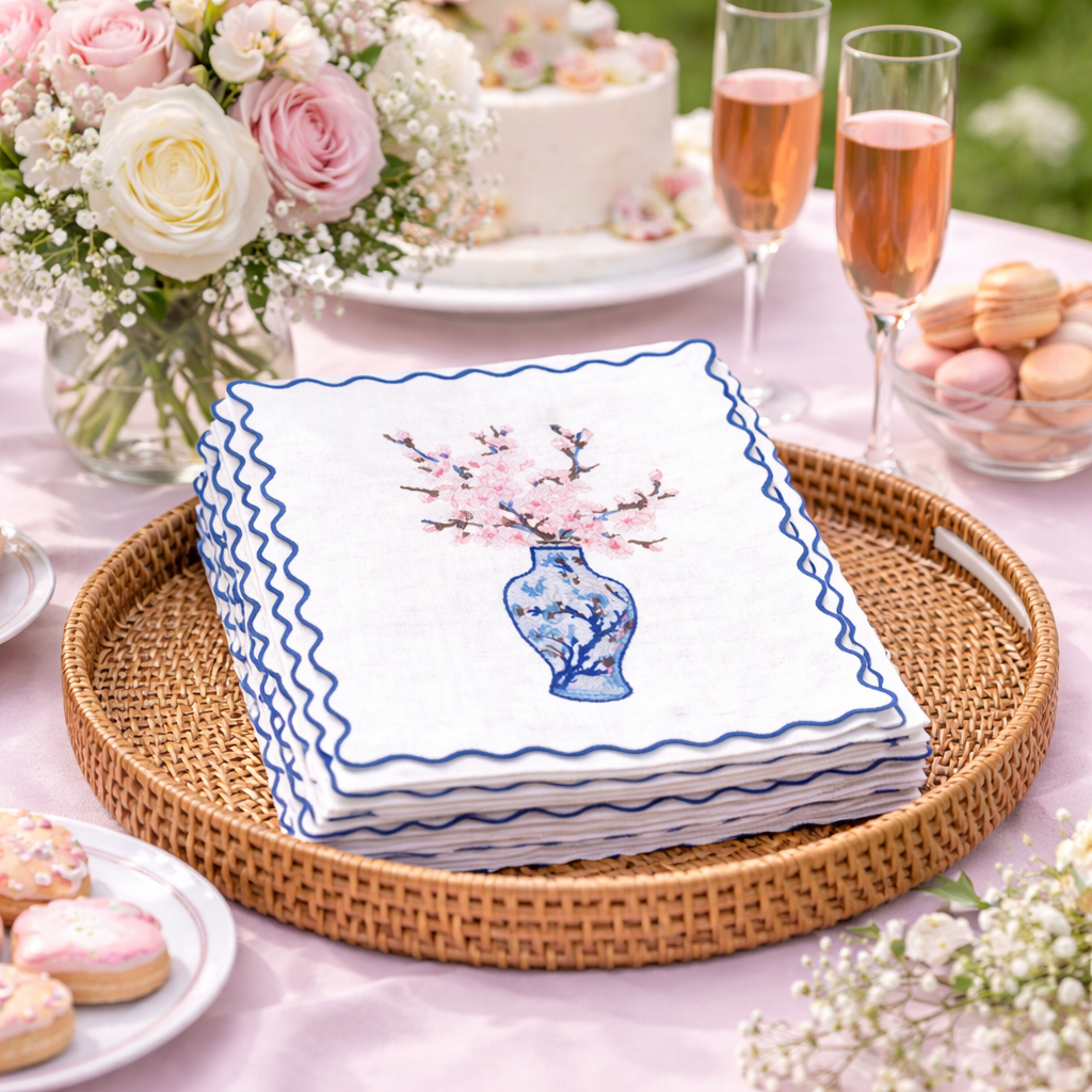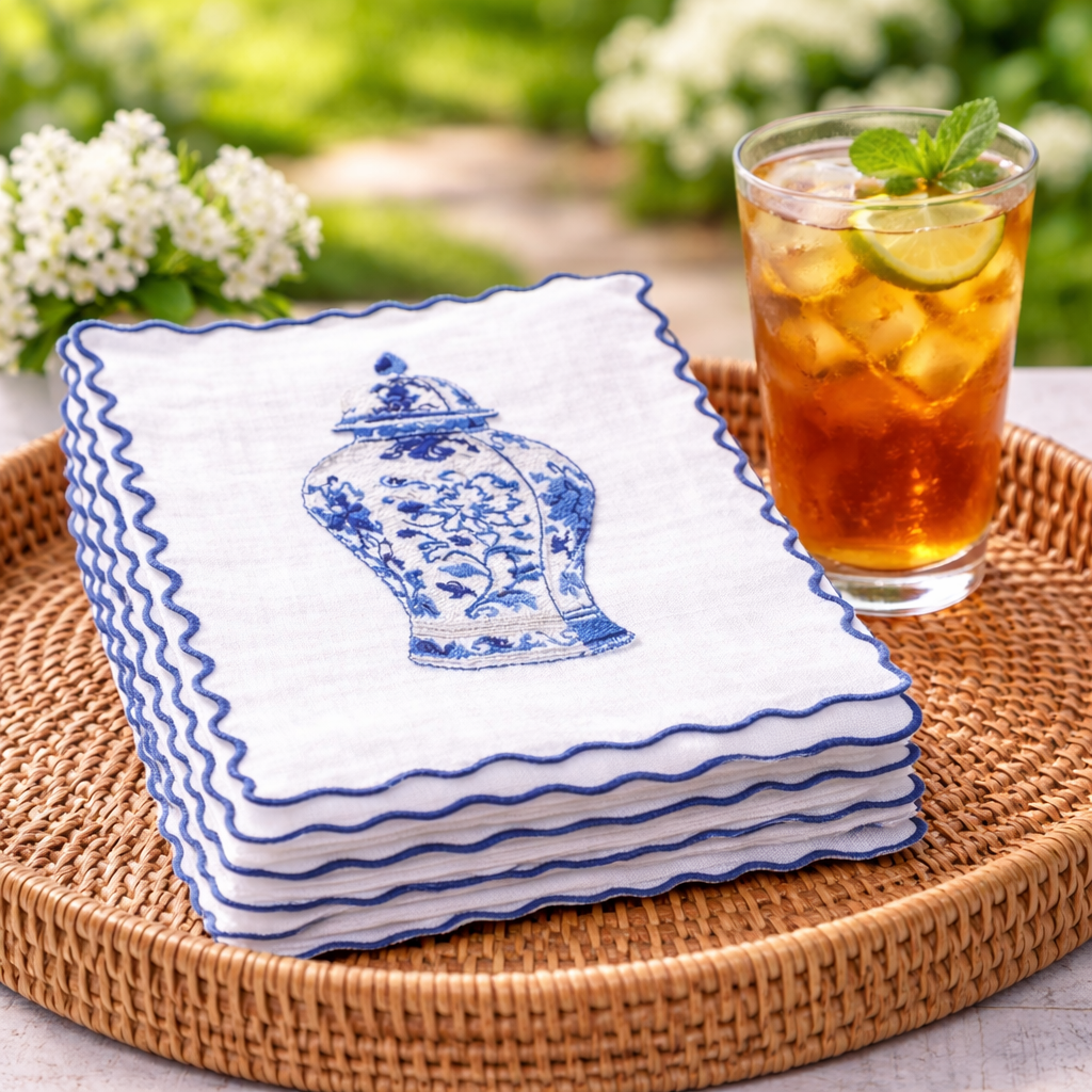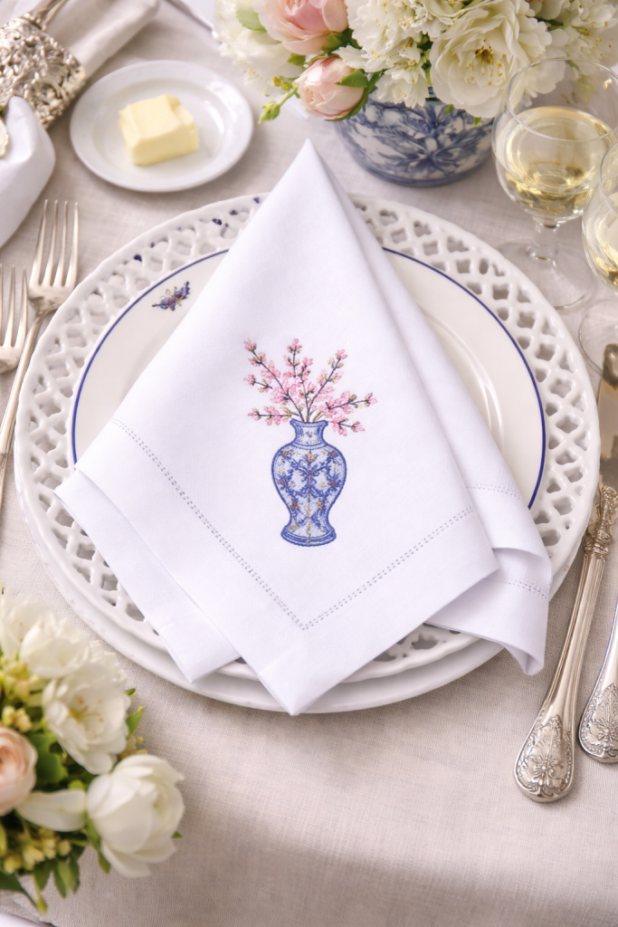 LINENS The beautiful embroidered cocktail napkins I shared with you are in the works, hope to have them within 2-3 weeks. SO excited about these! We will hold a presale probably next week. We also added four styles with hemstitch dinner napkins and matching placemats.Makes me want to throw a party!